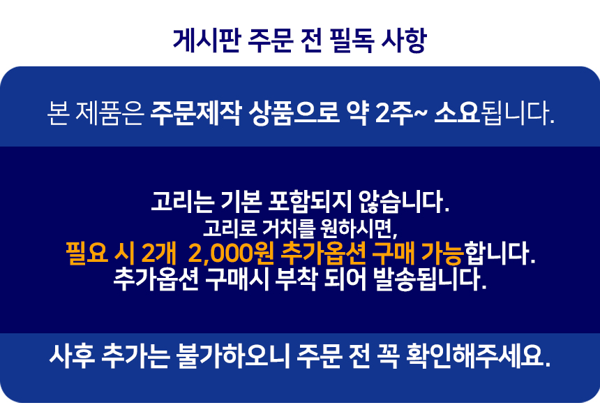 - 주문제작 상품의 경우 주문>디자인>시안 승인 후 에 제작이 진행되므로, 주문후 7~14일 (게시판제작시 최대3주) 정도 후에 받아보실 수 있습니다.