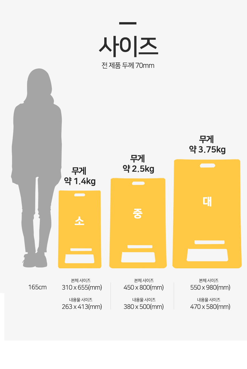 • 제품규격 소형 : 310X655X70 (mm) / 중형 : 450X800X70 (mm) / 대형 : 550X980X70 (mm)