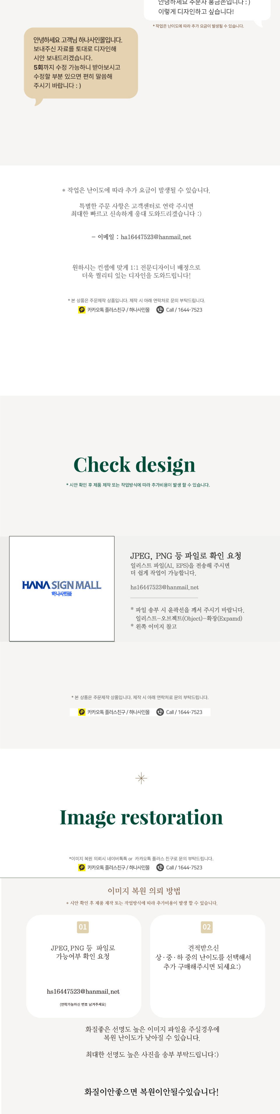 - 주문제작 상품의 경우 주문>디자인>시안 승인 후 에 제작이 진행되므로, 주문후 7~14일 (게시판제작시 최대3주) 정도 후에 받아보실 수 있습니다.