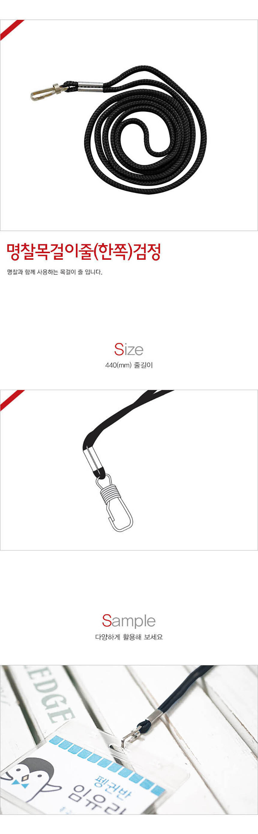 | 제품명 | 명찰목걸이줄 한쪽 검정 100개입 |