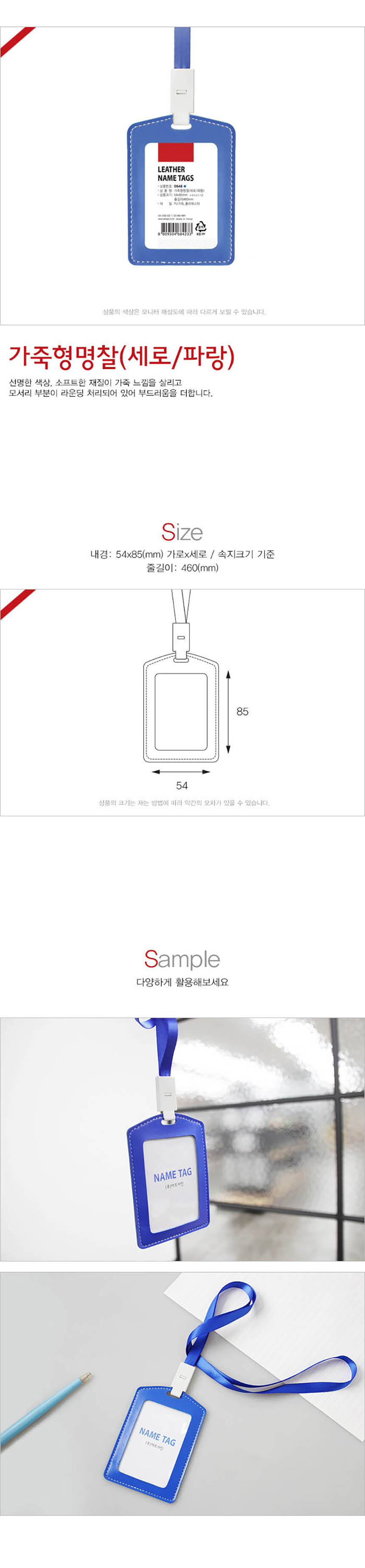 | 제품명 | 가죽형명찰 세로 파랑 1개입 목걸이줄 포함 |
