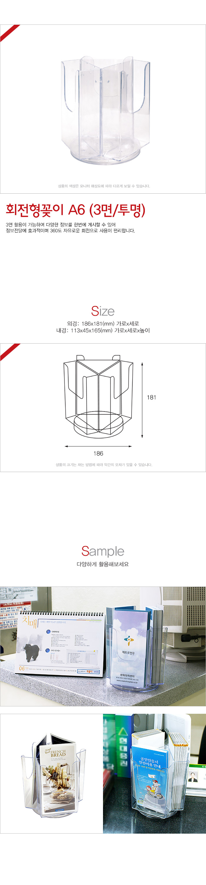| 제품명 | 회전형꽂이A6 3면 투명 1개입 1BOX 6개입 |