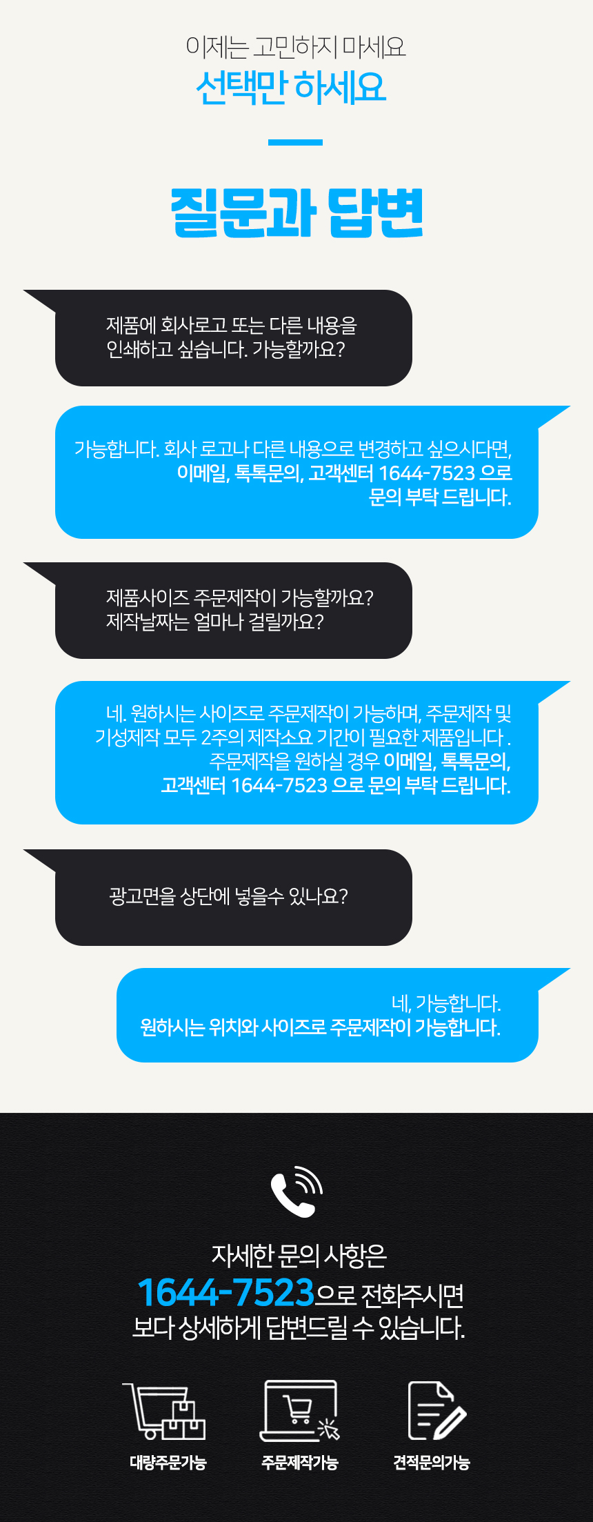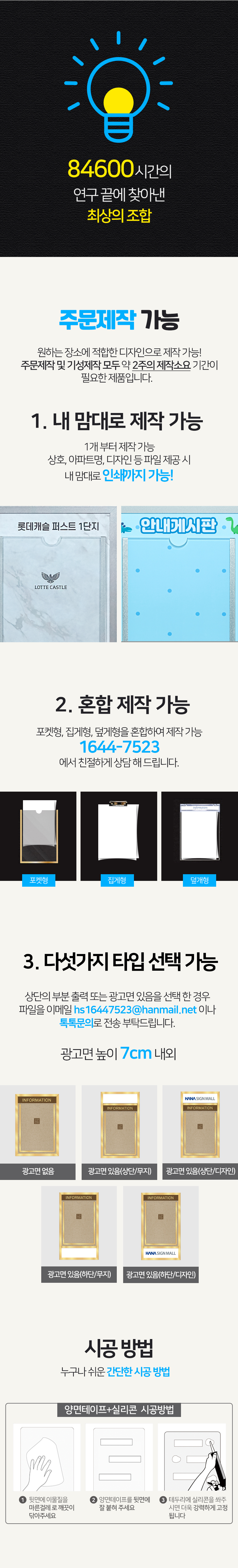 - 주문제작 상품의 경우 주문>디자인>시안 승인 후 에 제작이 진행되므로, 주문후 7~14일 (게시판제작시 최대3주) 정도 후에 받아보실 수 있습니다.