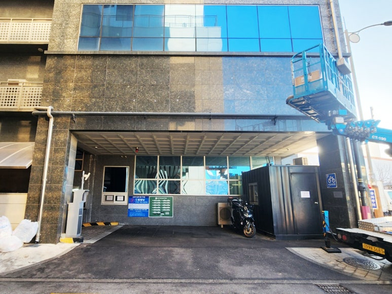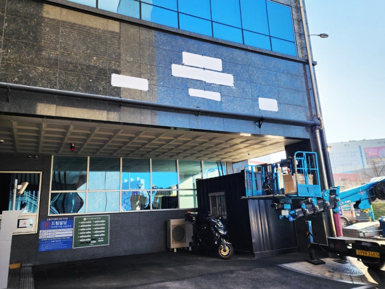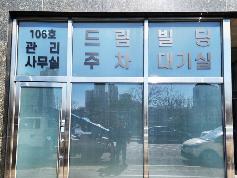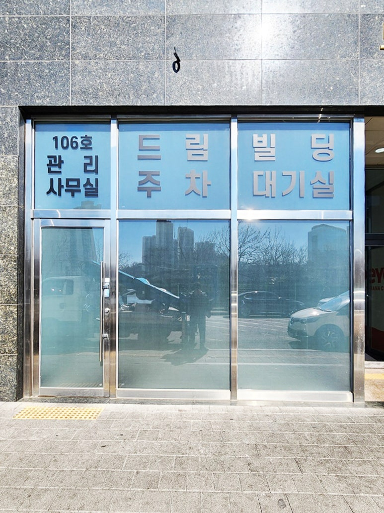 이번 드림빌딩의 주차장 간판과 유리문 시트 역시