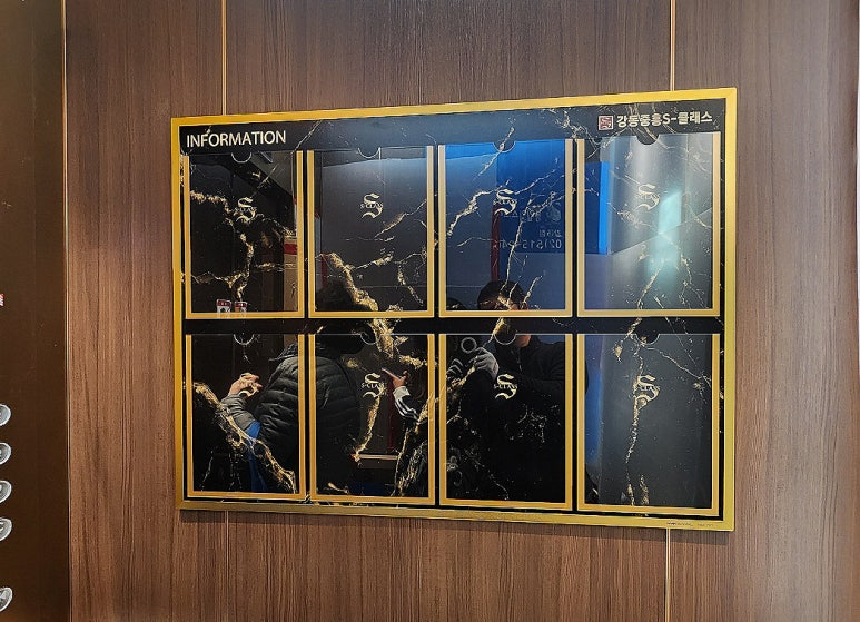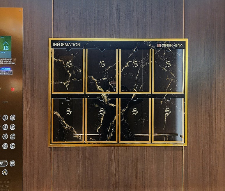 이번 게시판은 엘리베이터와 조화를 이루도록 세련된 실버 몰딩 디자인으로 제작되었어요!