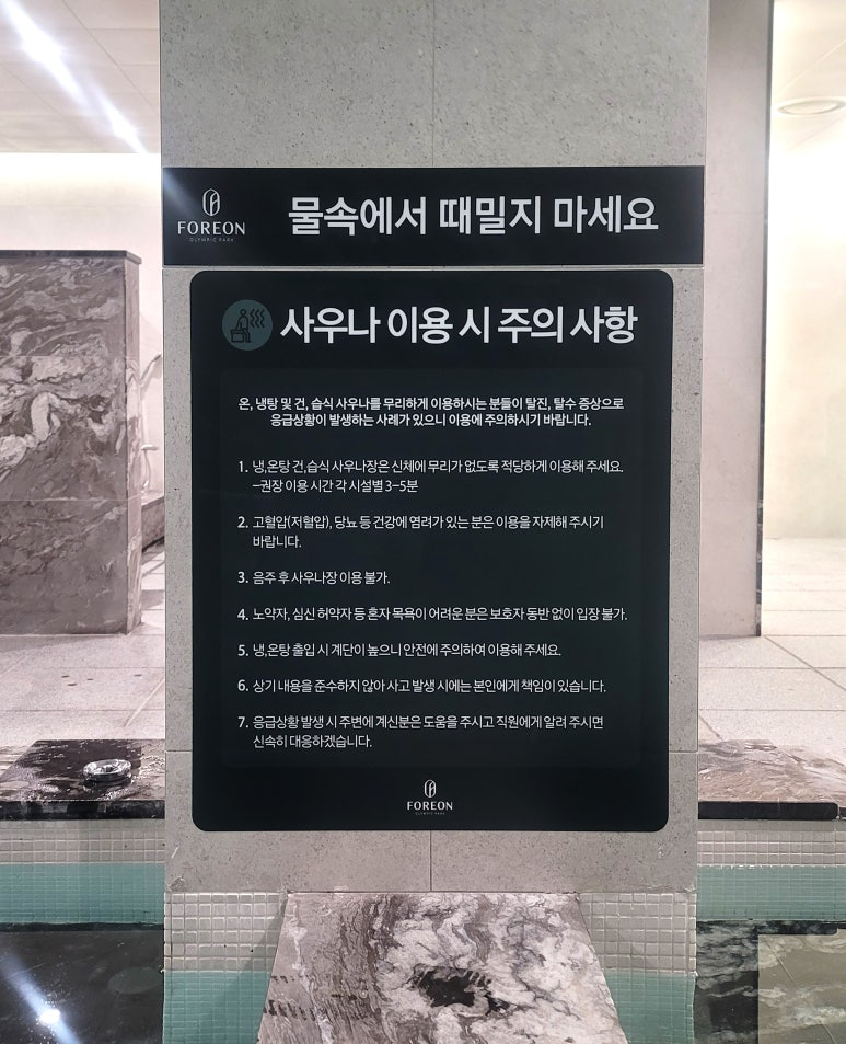 탕에 부착한 사우나 주의사항, 물속에서 때밀지 마세요 스티커입니다~!