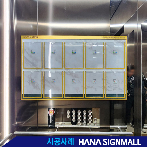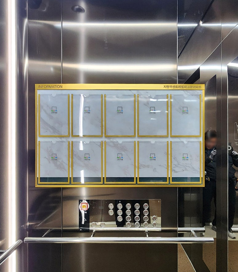 위 사진은 엘리베이터에 10구 게시판을 시공한 모습입니다!