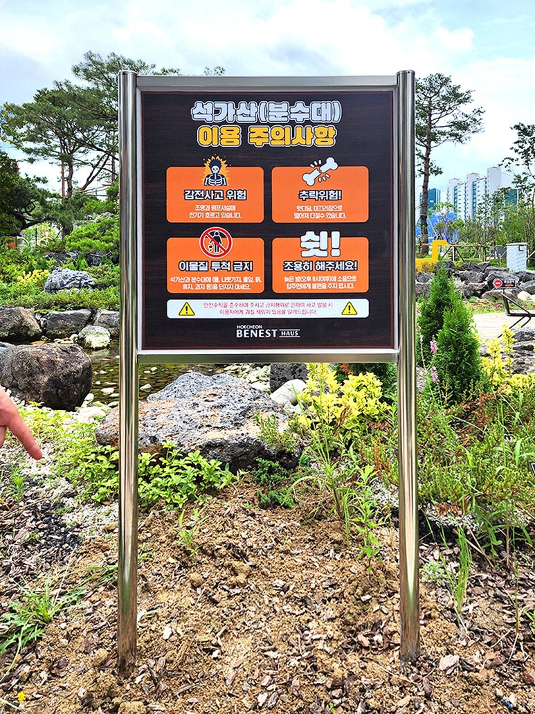 스텐 표지판을 매립 방식으로 지반에 깊이 묻어 시공하여