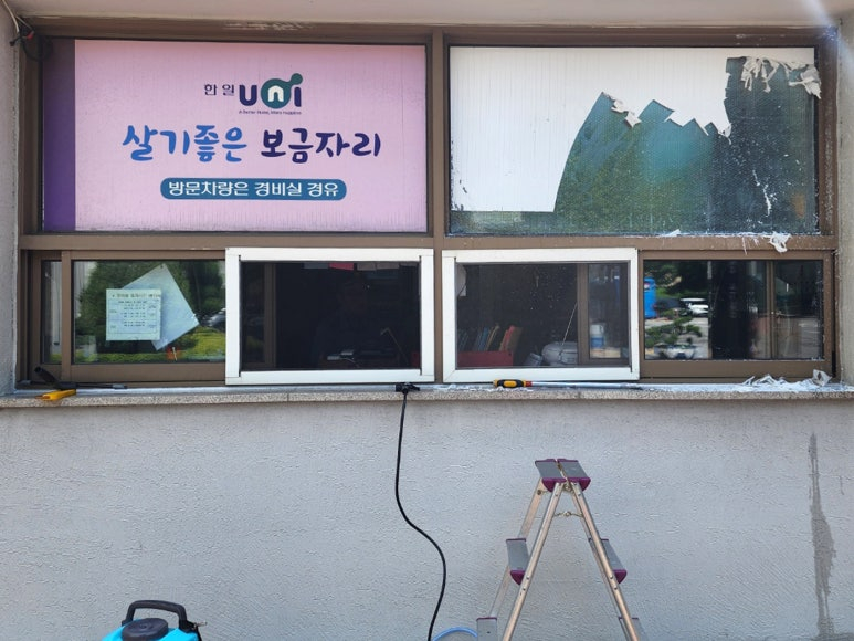 하나사인몰에서 제작한 시트를 부착하기 위해 기존에 있던 걸 제거하는 작업을 하는 모습입니다!