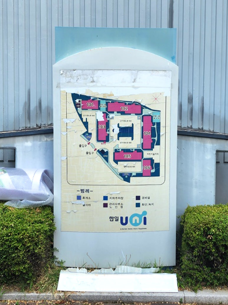 기존 단지안내도는 오랜 사용으로 인해 시트가 곳곳에서 떨어지고 색도 바래 있어,