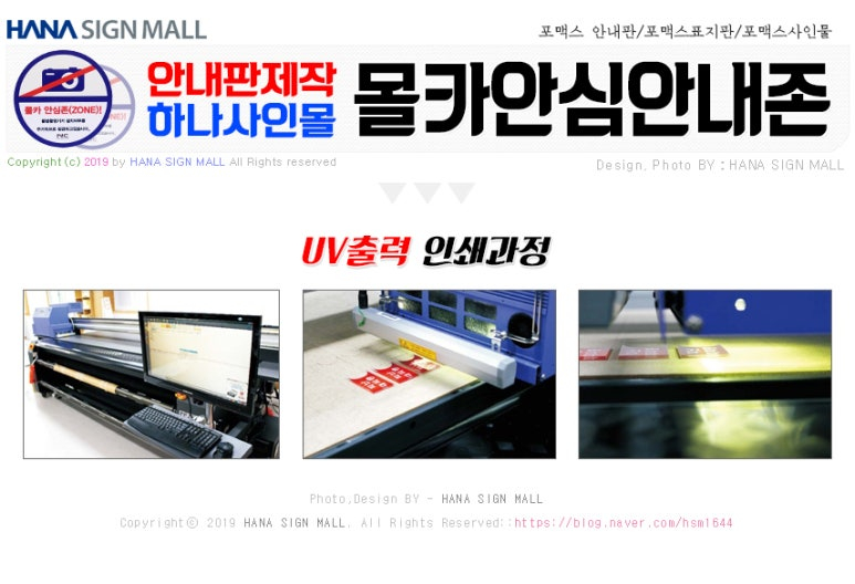 저희 하나사인몰은 몰카안심존 표지판을 uv로 인쇄하여 물과 불에 굉장히 강하며