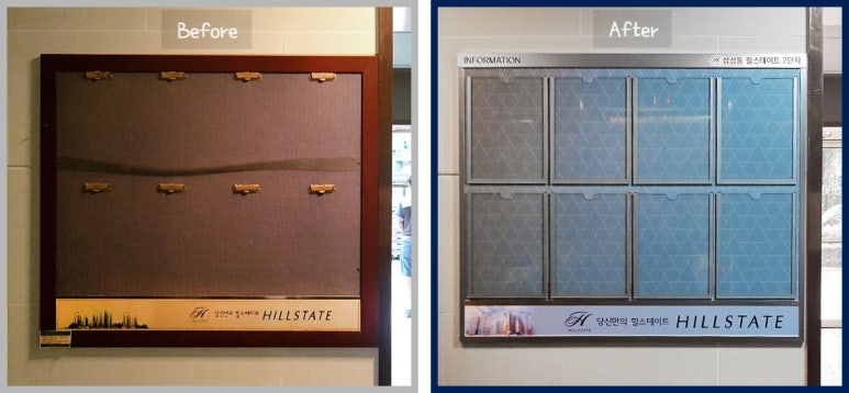 A pocket metal silver type bulletin board was installed in the Hill State 2 apartment in Samsung-dong.