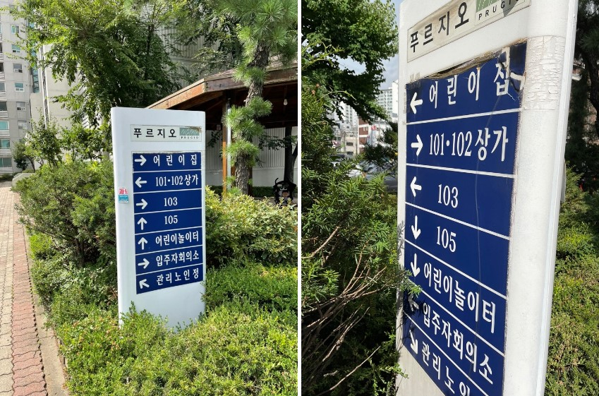 아파트 단지 위치 방향표지판 으로 아파트 단지 내 주민분들이 단지 내