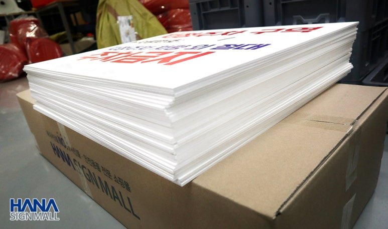 저희가 인쇄와 컷팅 작업을 마친 후 타공지점을 뚫어드리기 위해 모아놓은 주차금지 안내판들이에요