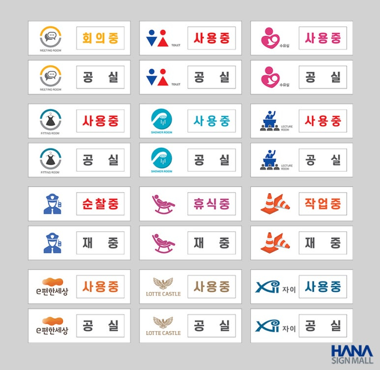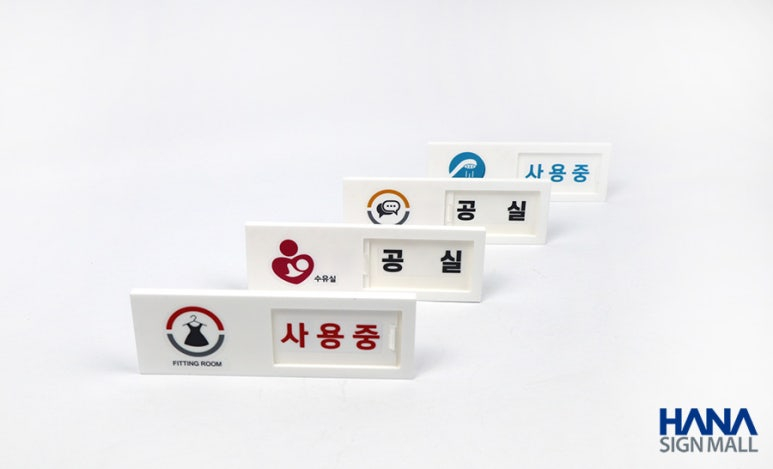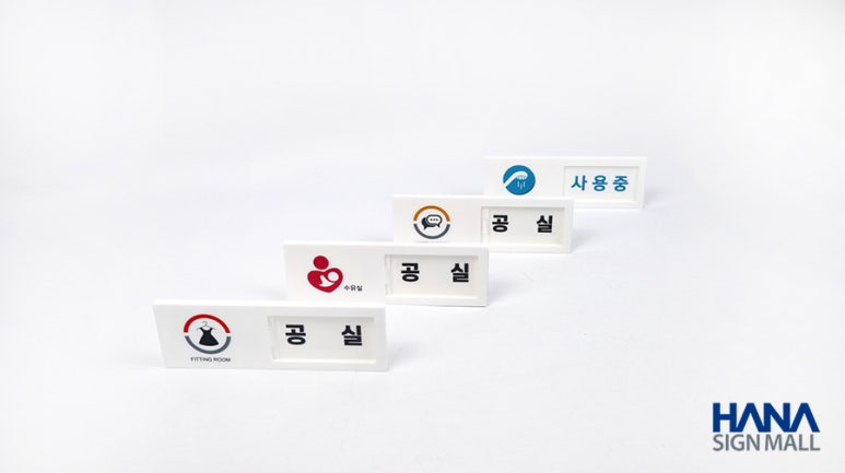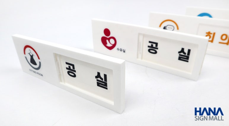 이 아크릴 여닫이 안내판들은 하나사인몰의 디자이너 분들이 디자인한 제품들이에요