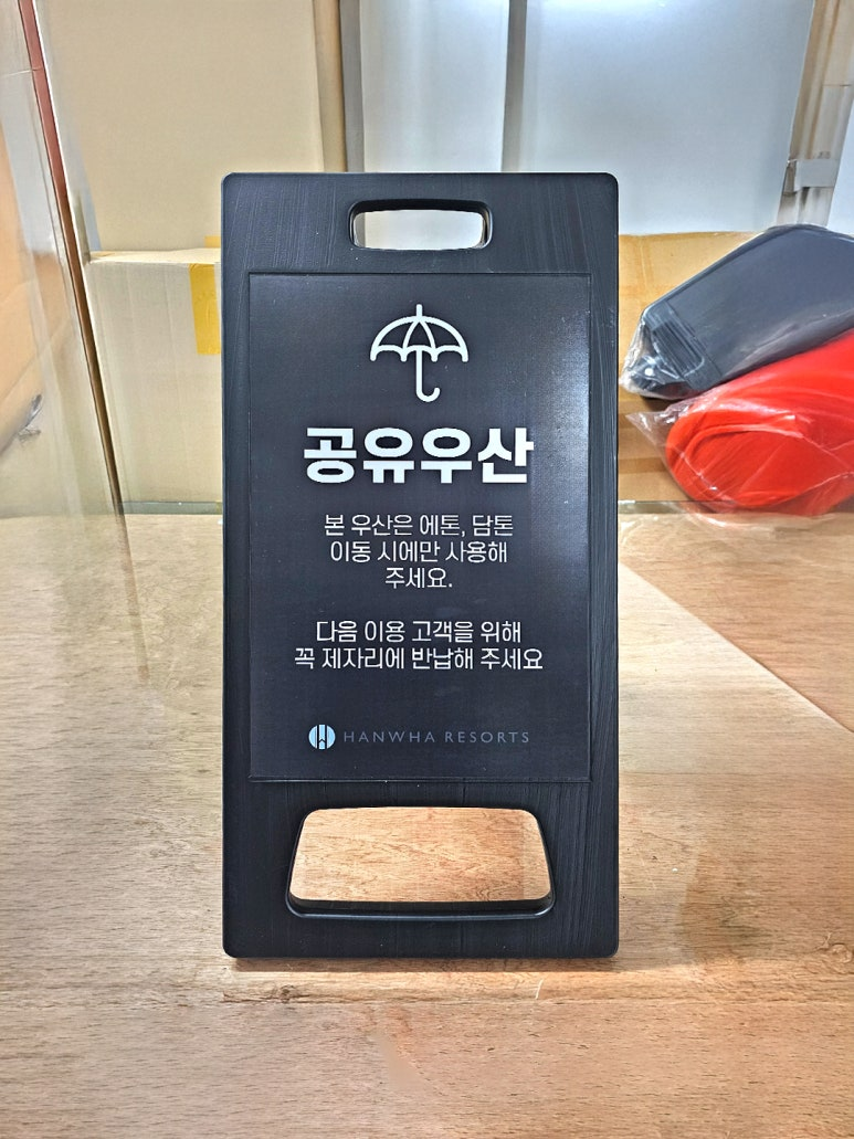 비 오는 날 고객 편의를 위해 설치되는 공유우산 안내 입간판!