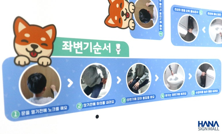 올바른 손씻기 순서인 손씻기6단계와 화장실 사용순서를 알려줄 수 있는 안내판이에요