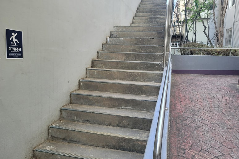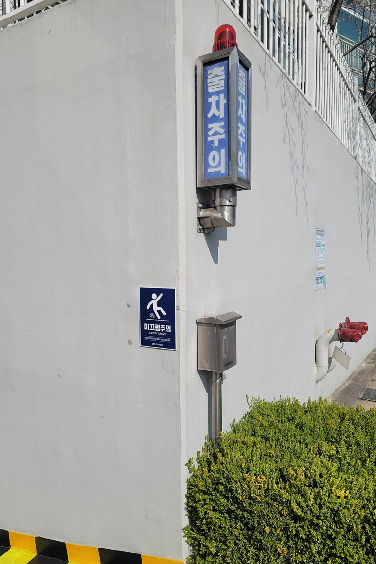 미끄럼주의 안내판은 계단 또는 경사가 있는 구간에 설치하여