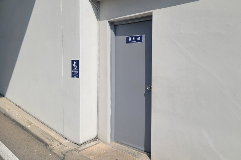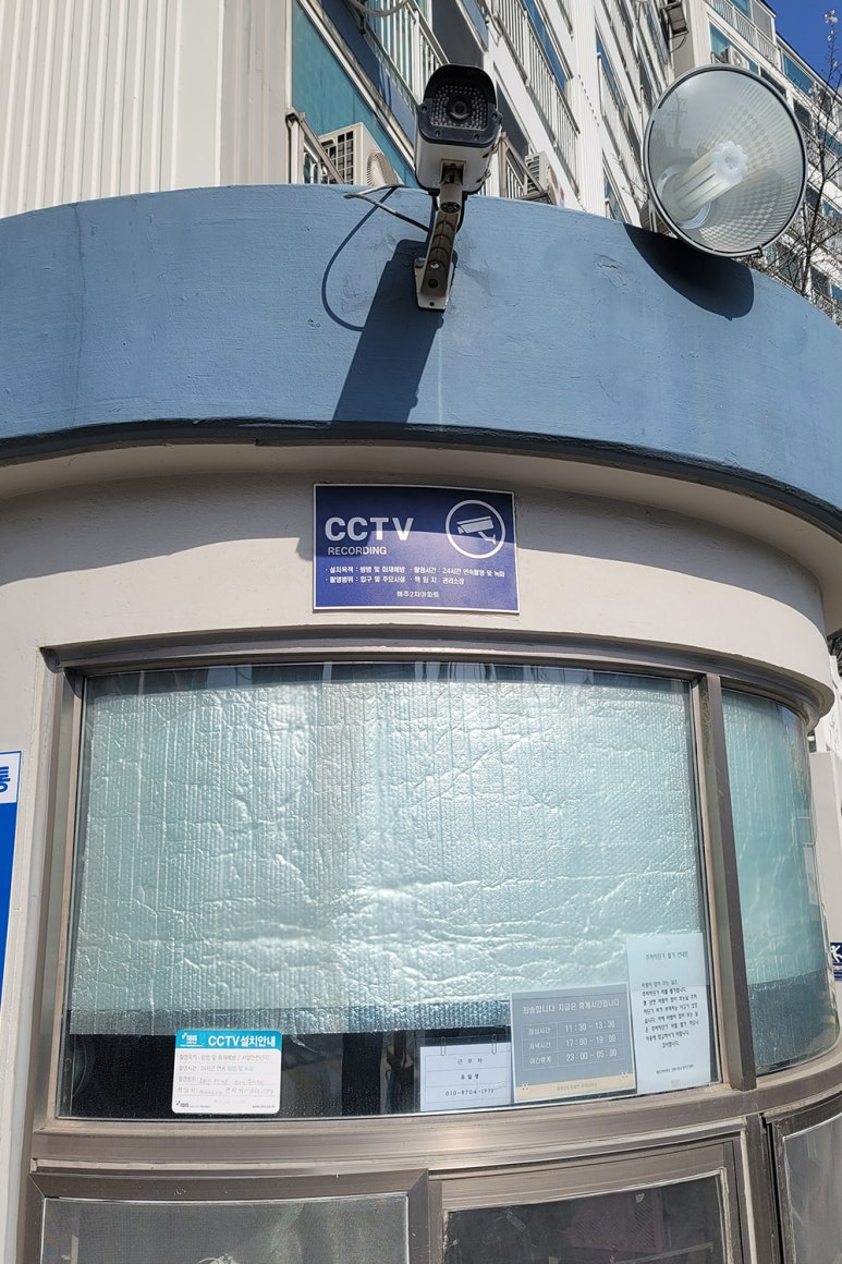 이렇게 경비실 외부에 부착하여 CCTV가 녹화중 인것을 알리는 안내판입니다.