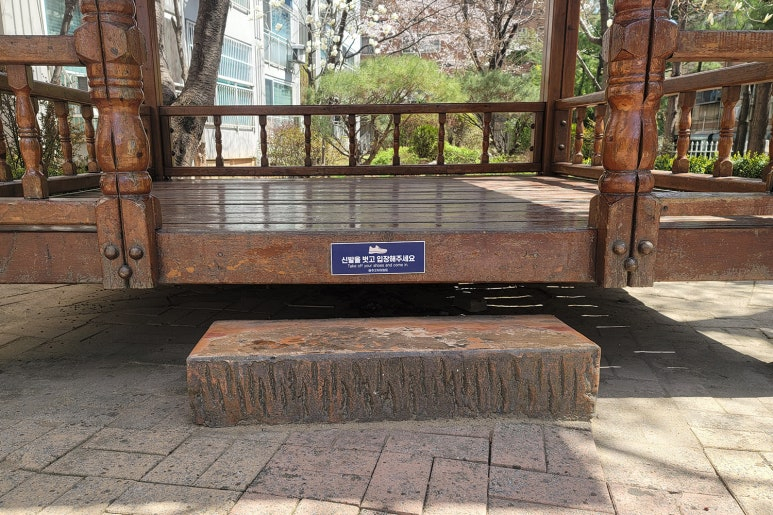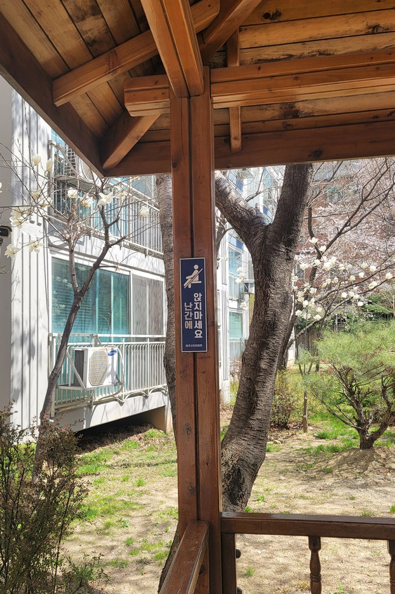 난간에 앉지 마세요 표지판 또한 정자에 설치하여 난간에서 추락하는 것을 예방하기 위한 표지판입니다.