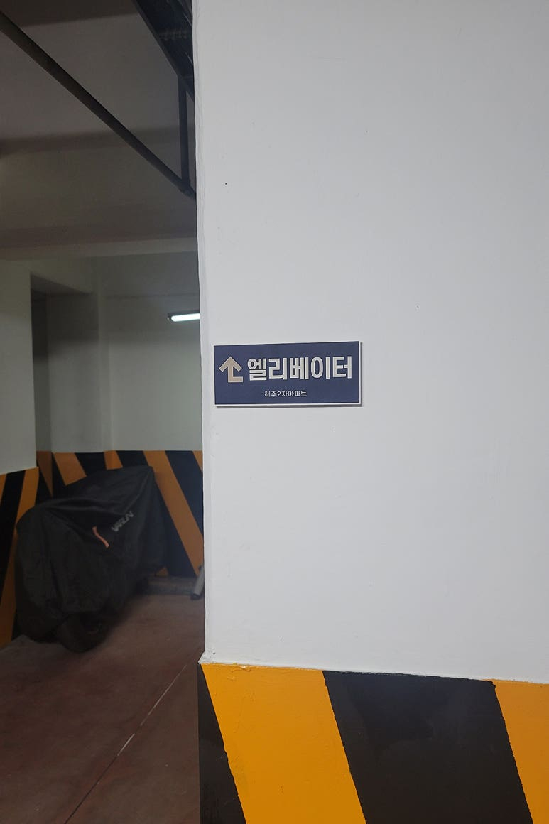 주차장 내 엘리베이터 위치를 표시하는 안내판입니다.