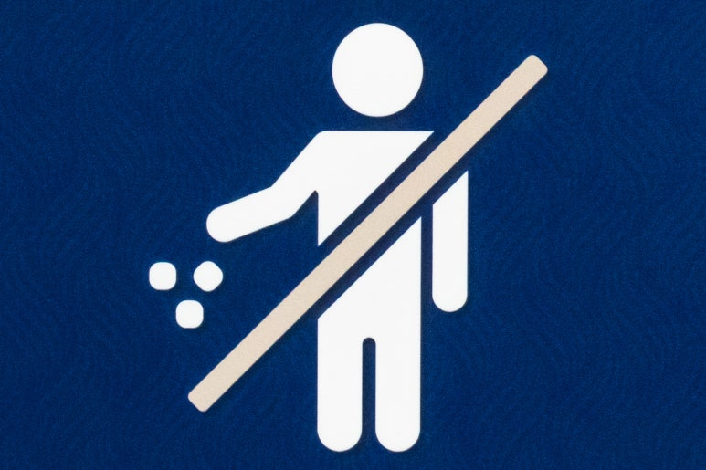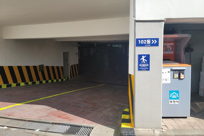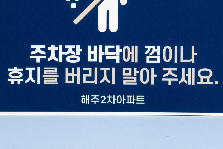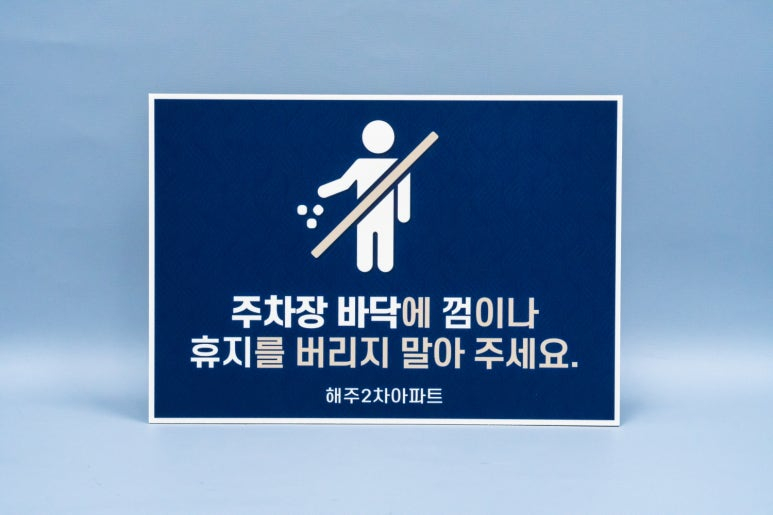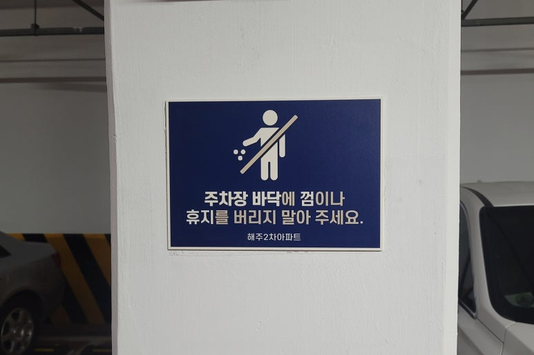 다음으로 주차장 바닥에 껌, 휴지를 버리지 마시오 안내판입니다.