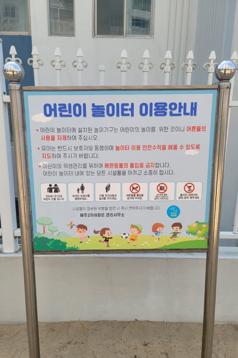 아파트 단지 내 어린이 놀이터 이용시설 안내판을 설치한 모습입니다.