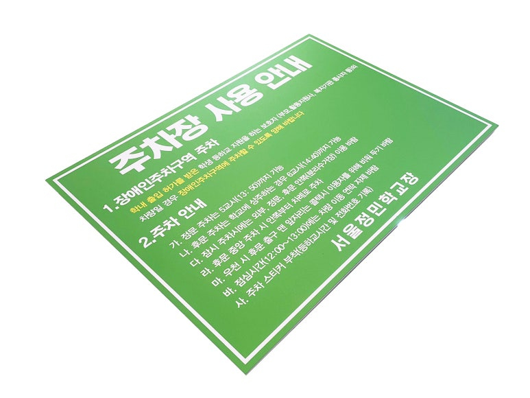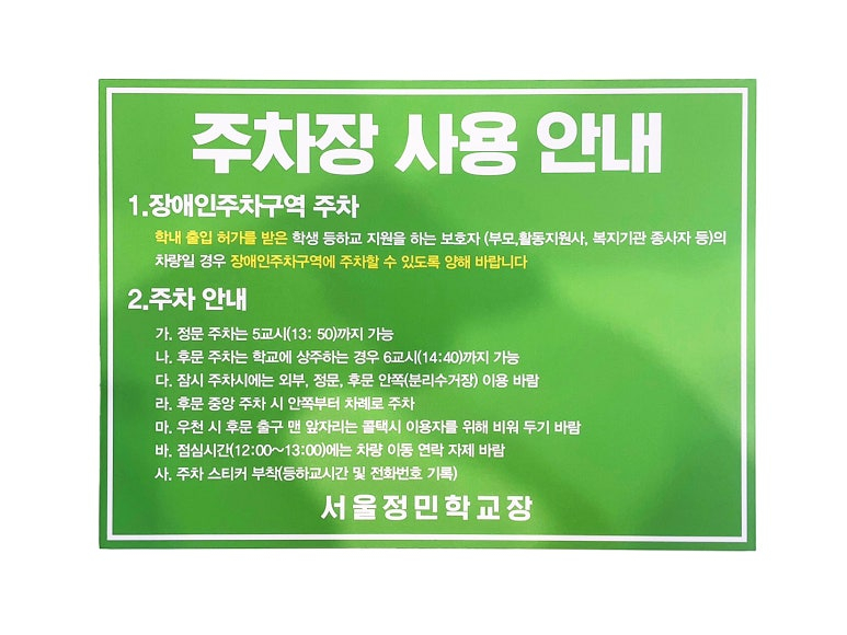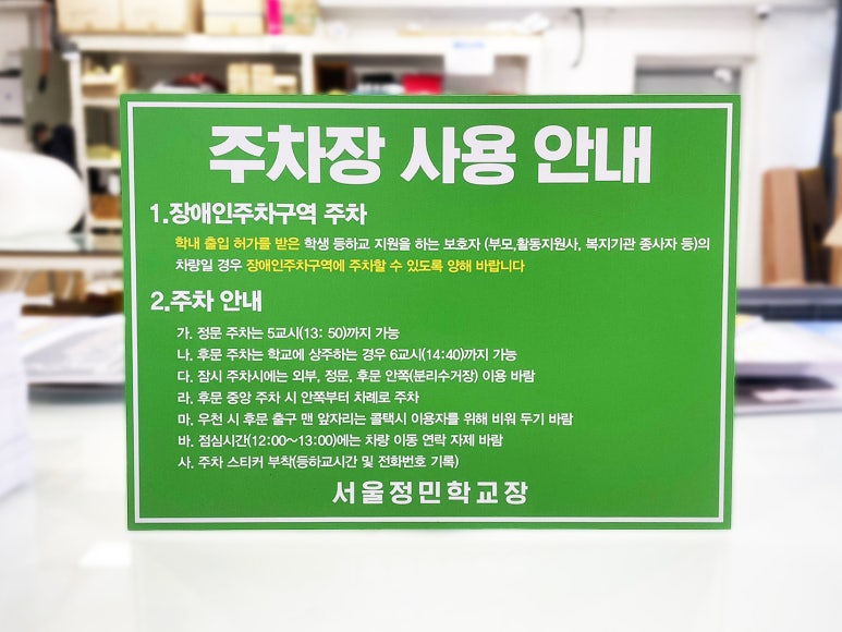 다음은 서울정민학교에서 주문해 주신 주차장 사용 안내판입니다~!