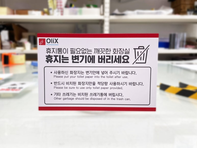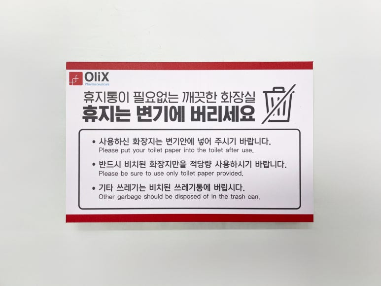 휴지통을 없애고 휴지는 변기에 넣도록 안내판을 제작했습니다~