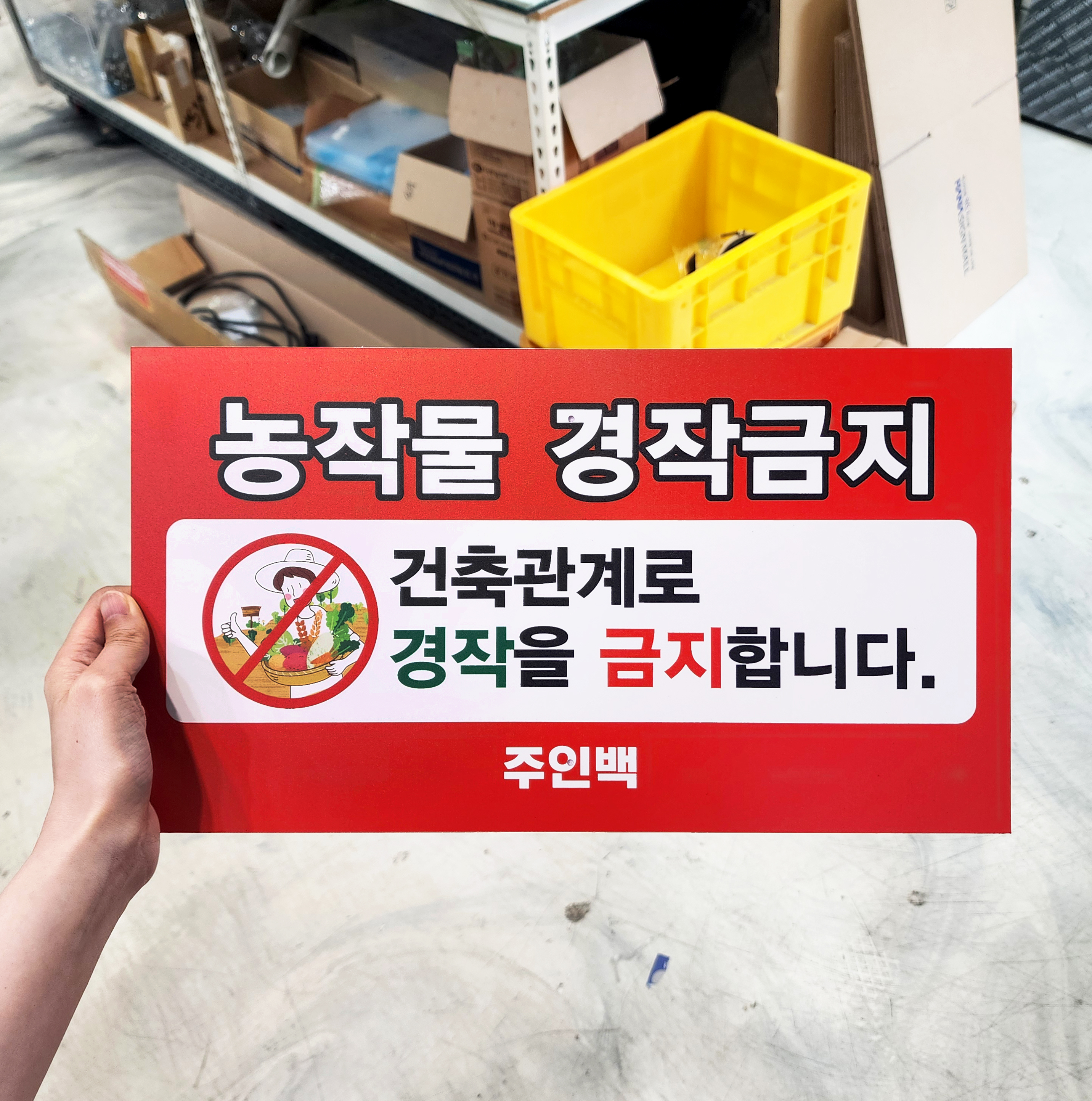 오늘은 개조심 표지판, 무단 농작물 경작금지 팻말,