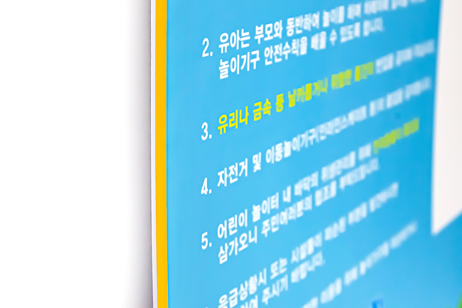 포맥스 타입의 안내판과 젖거나 찢어지지 않는 재질로 색상 변색이 적고, 인쇄 품질이 매우 우수한