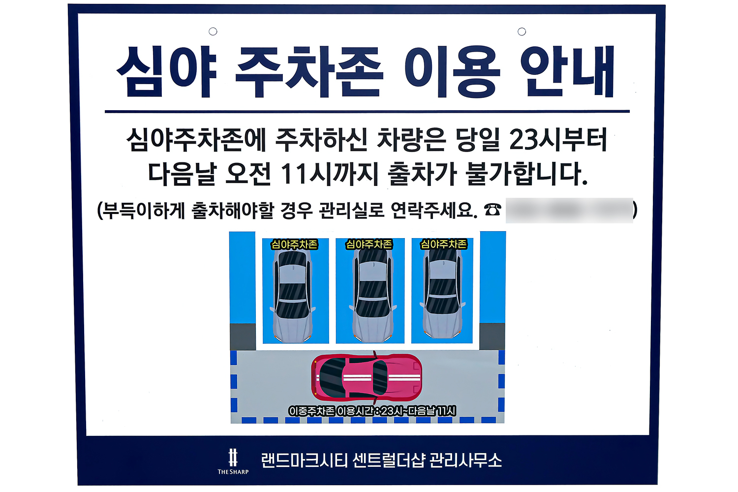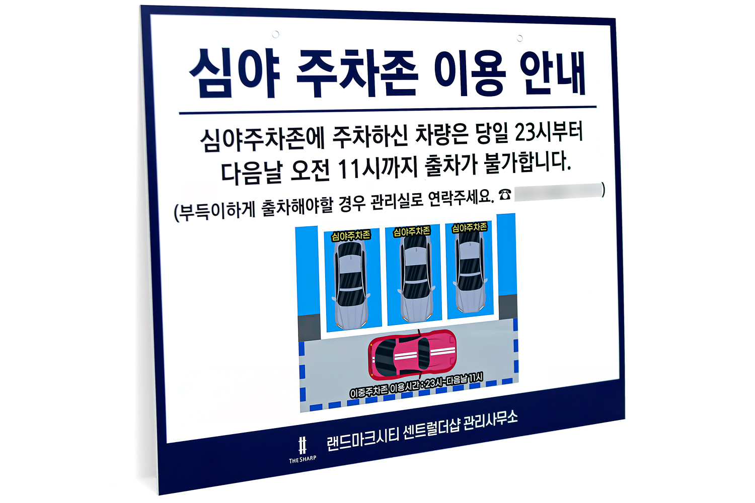 다음은 랜드마크시티센트럴더샵에서 주문 제작 요청해 주신 심야 주차존 이용 안내판입니다!