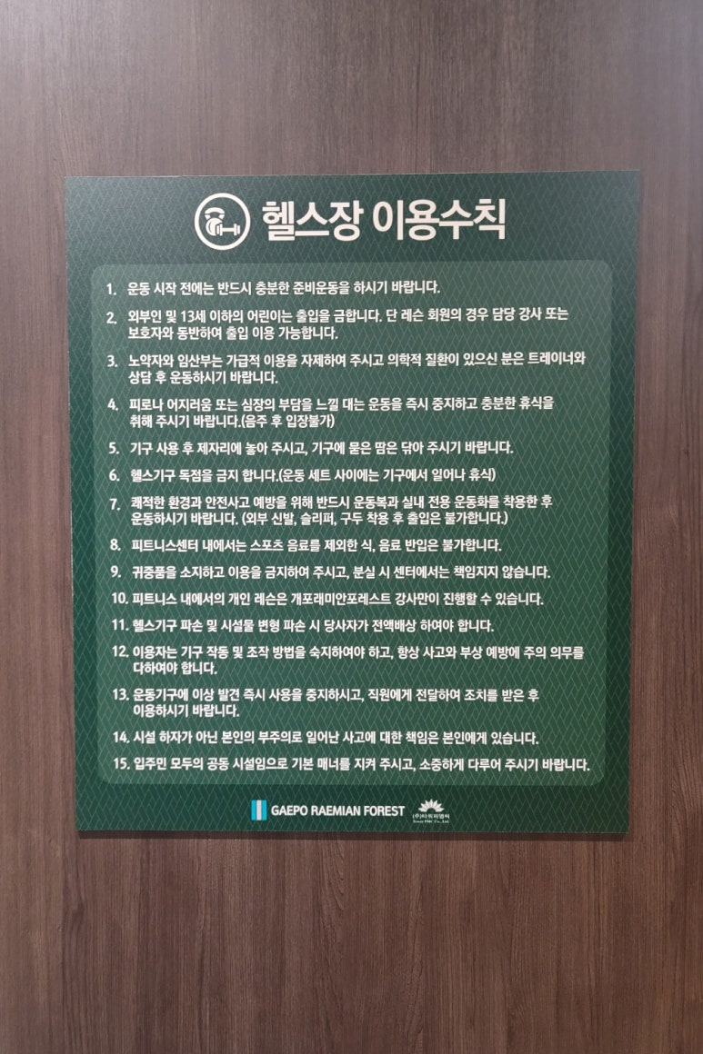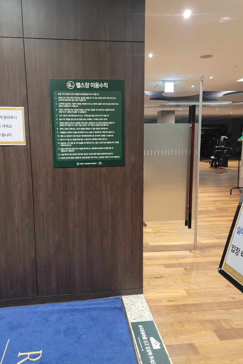 이렇게 벽면에 헬스장 이용수칙 안내판이 부착된 것을 보실 수 있습니다.