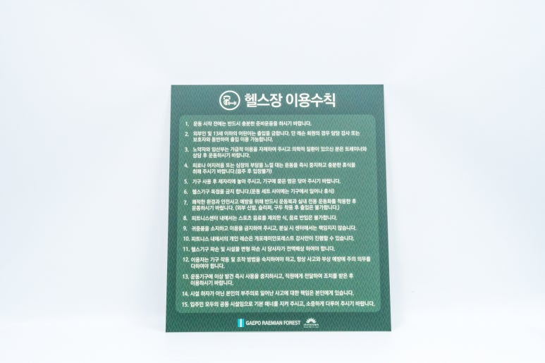 다음으로 헬스장에 시공된 안내판, 스티커를 보여드리겠습니다.