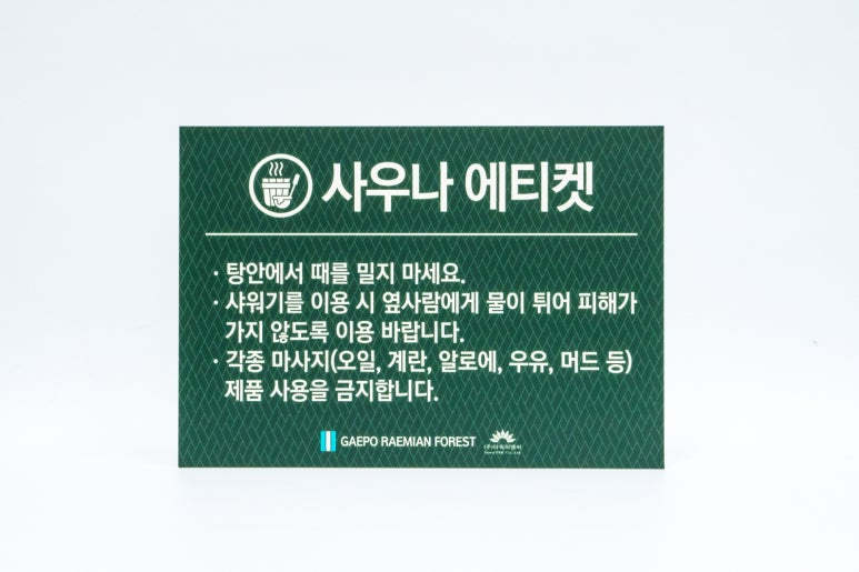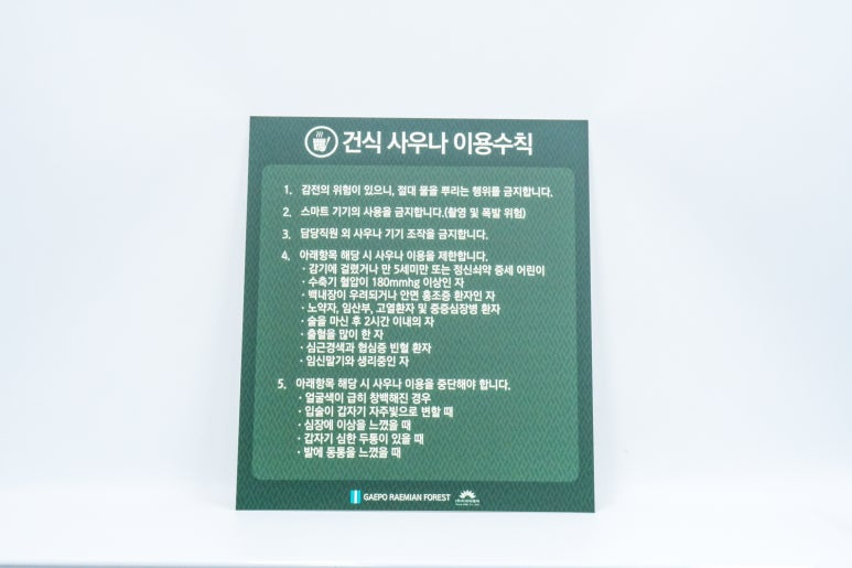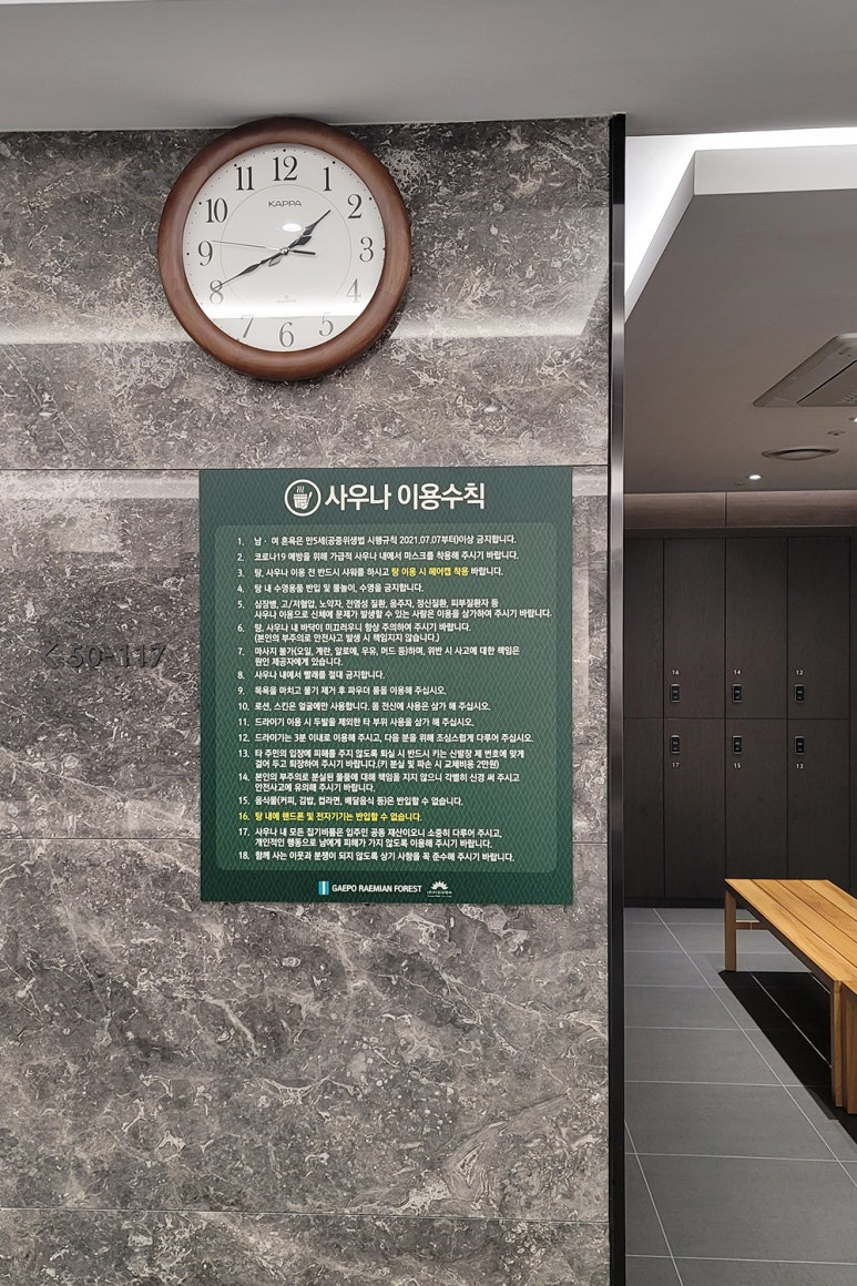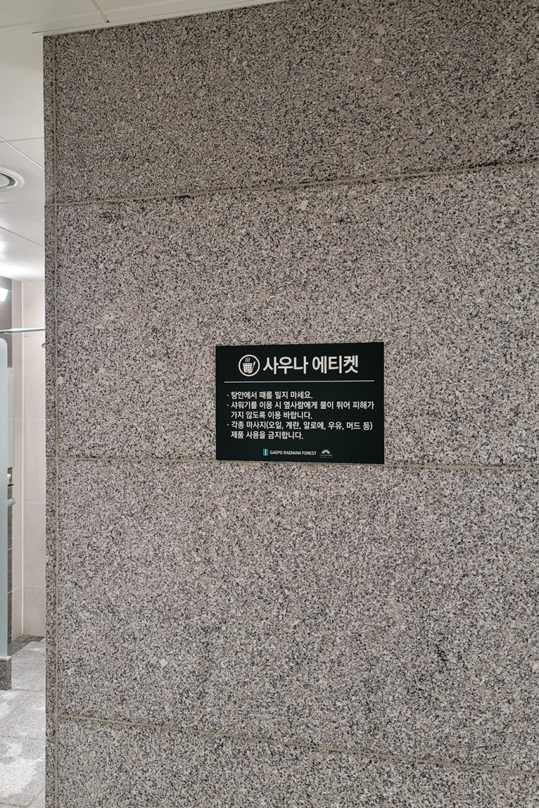 사우나 이용수칙 안내판이 부착되어 있습니다.