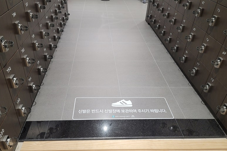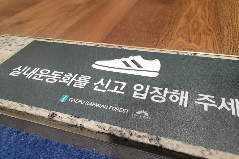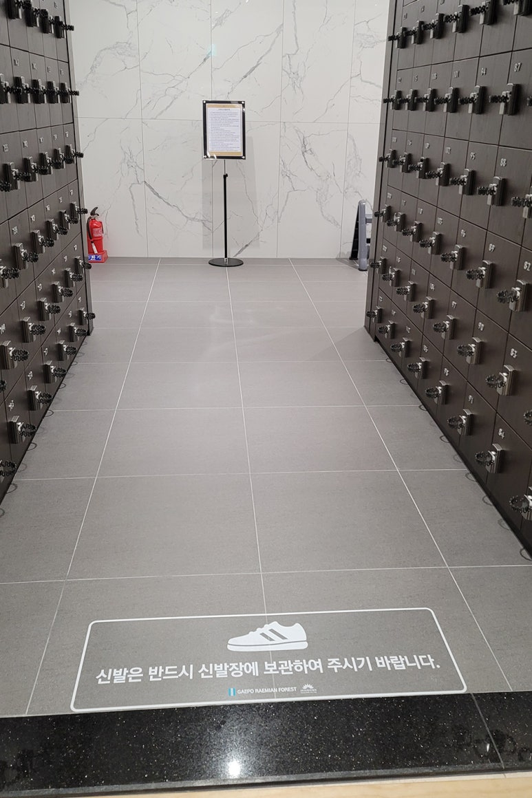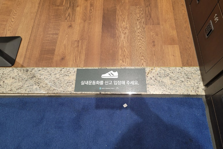 입구로 들어가시면 바닥에 실내운동화를 신고 입장해 주세요 바닥 스티커가