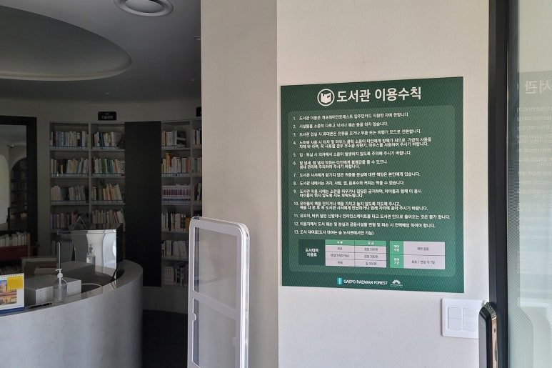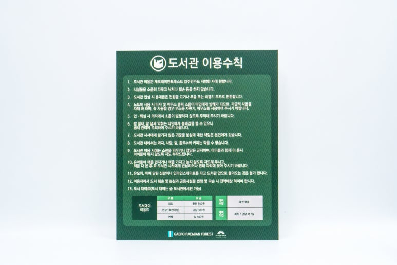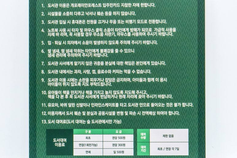 안내판에는 이용수칙과 도서대여 이용료가 같이 작성되어 있습니다.