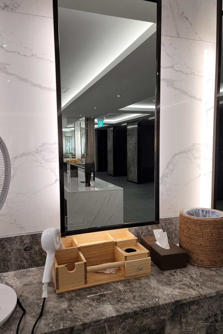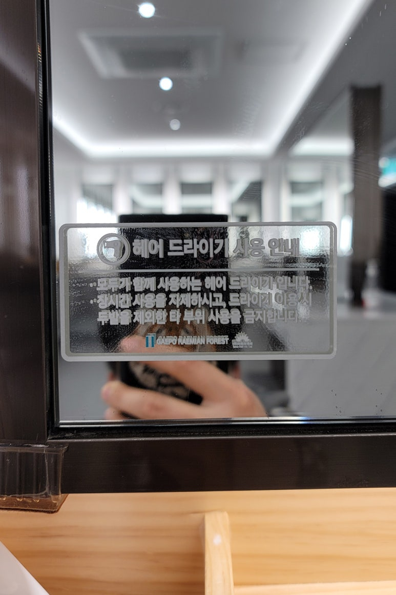 헤어 드라이기 이용 안내 문구가 잘 보이도록 거울에 부착되어 있습니다.