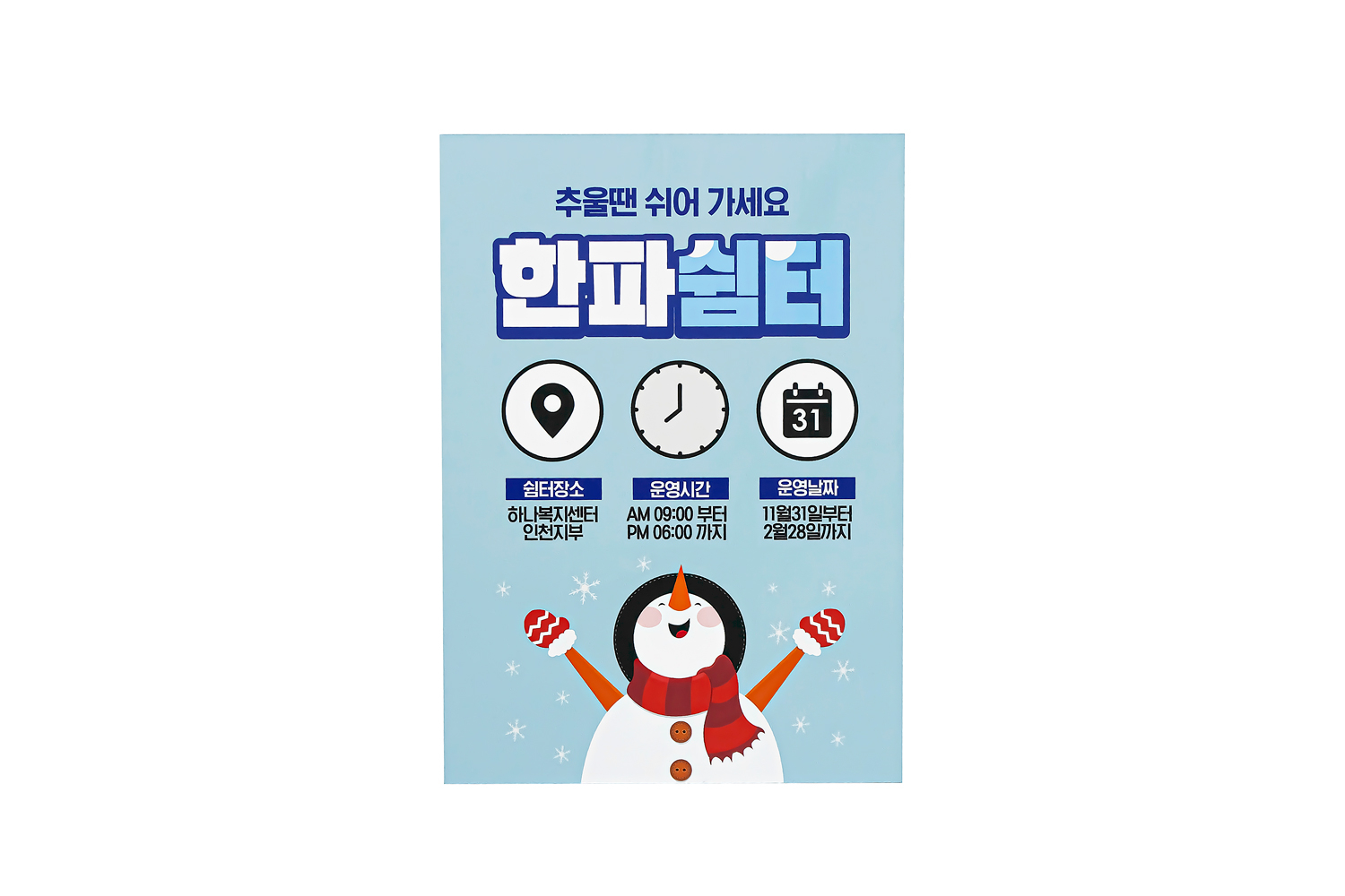 한파 쉼터가 있는 모든 곳에 부착하여 한파 쉼터의 장소, 운영 시간, 날짜 등을 쉽게 알릴 수 있는데요!