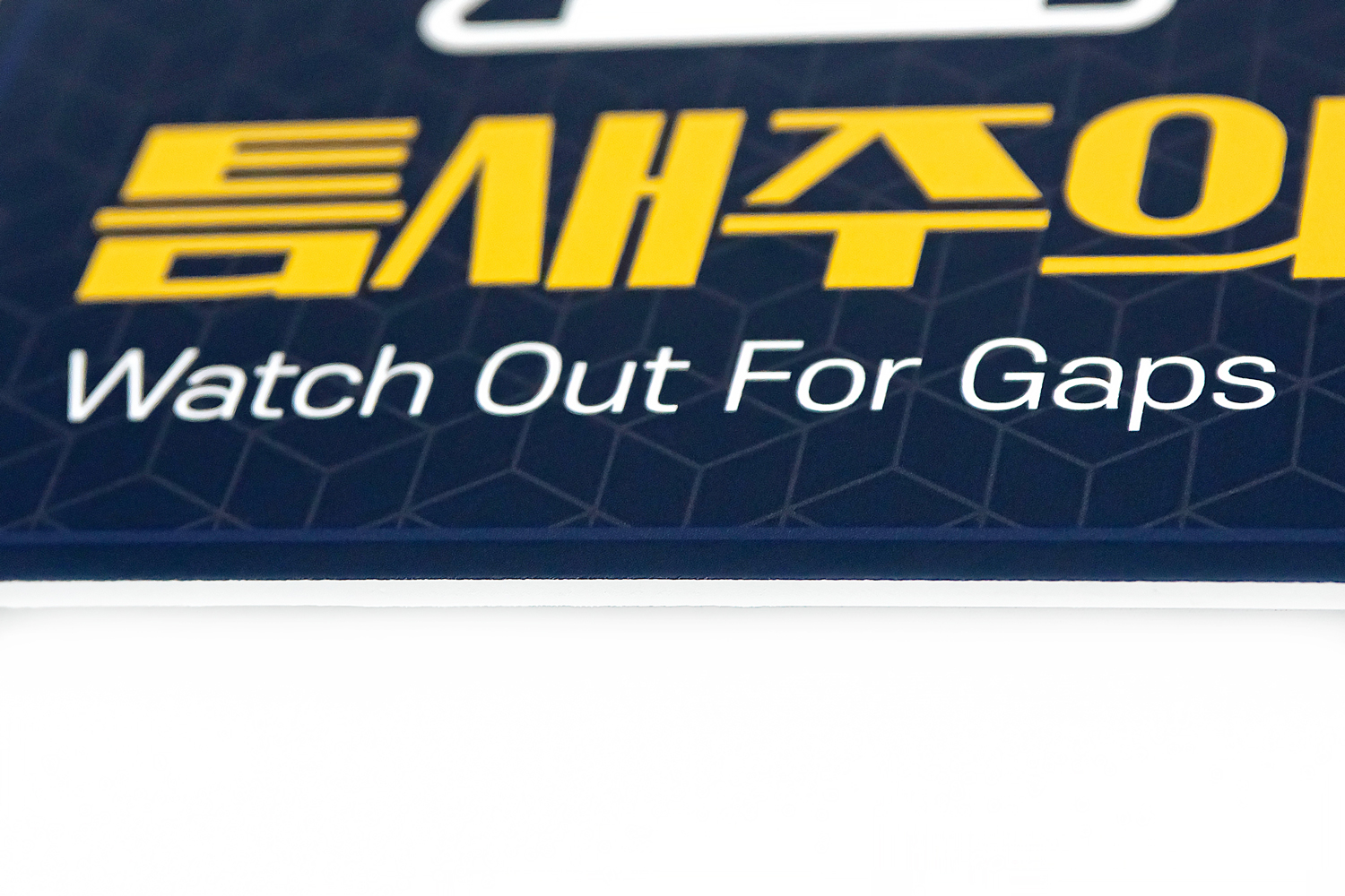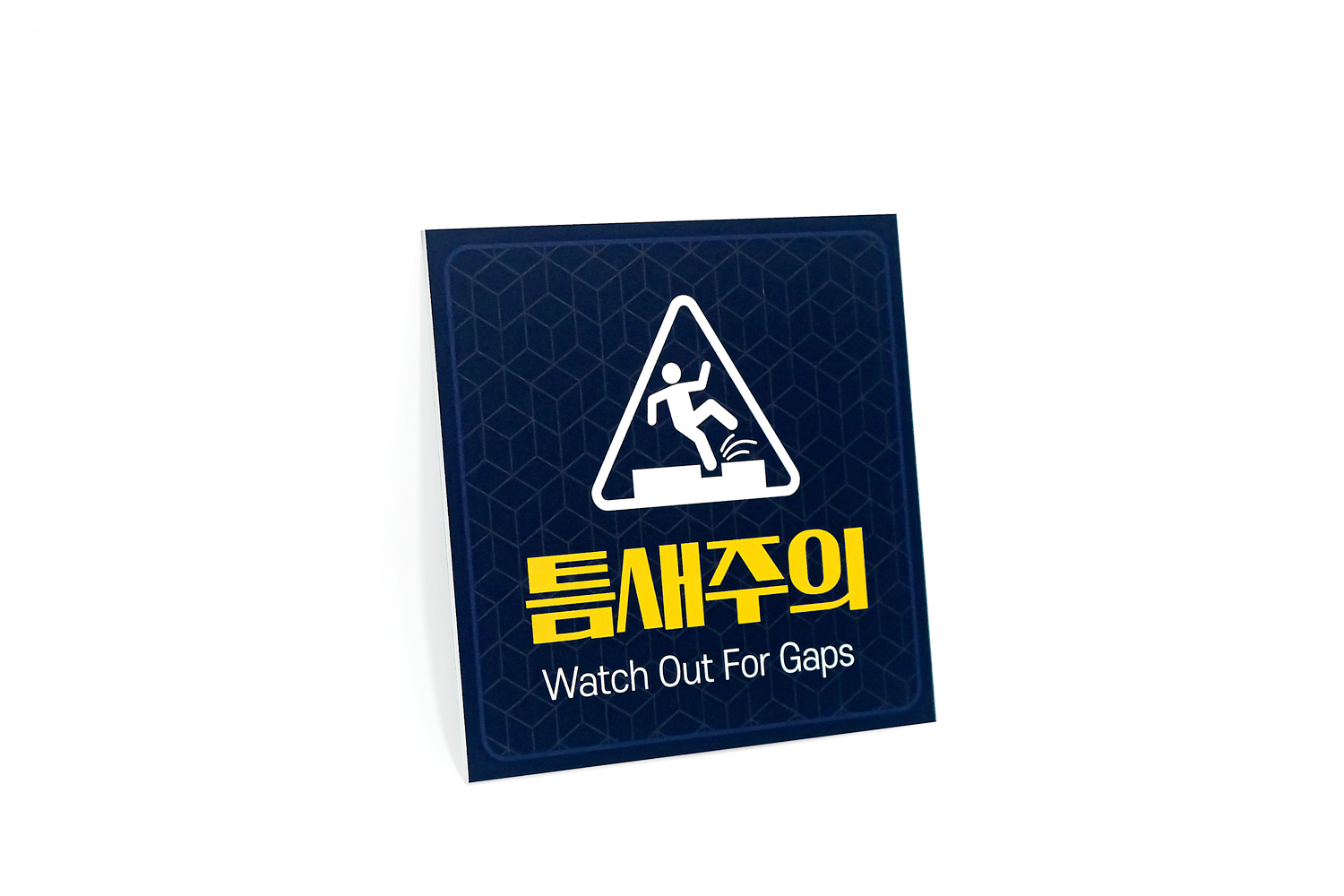 바닥이나 계단 등 틈새로 인한 사고가 발생할 수 있는 모든 곳에 부착하여 사용할 수 있는 안내판인데요!