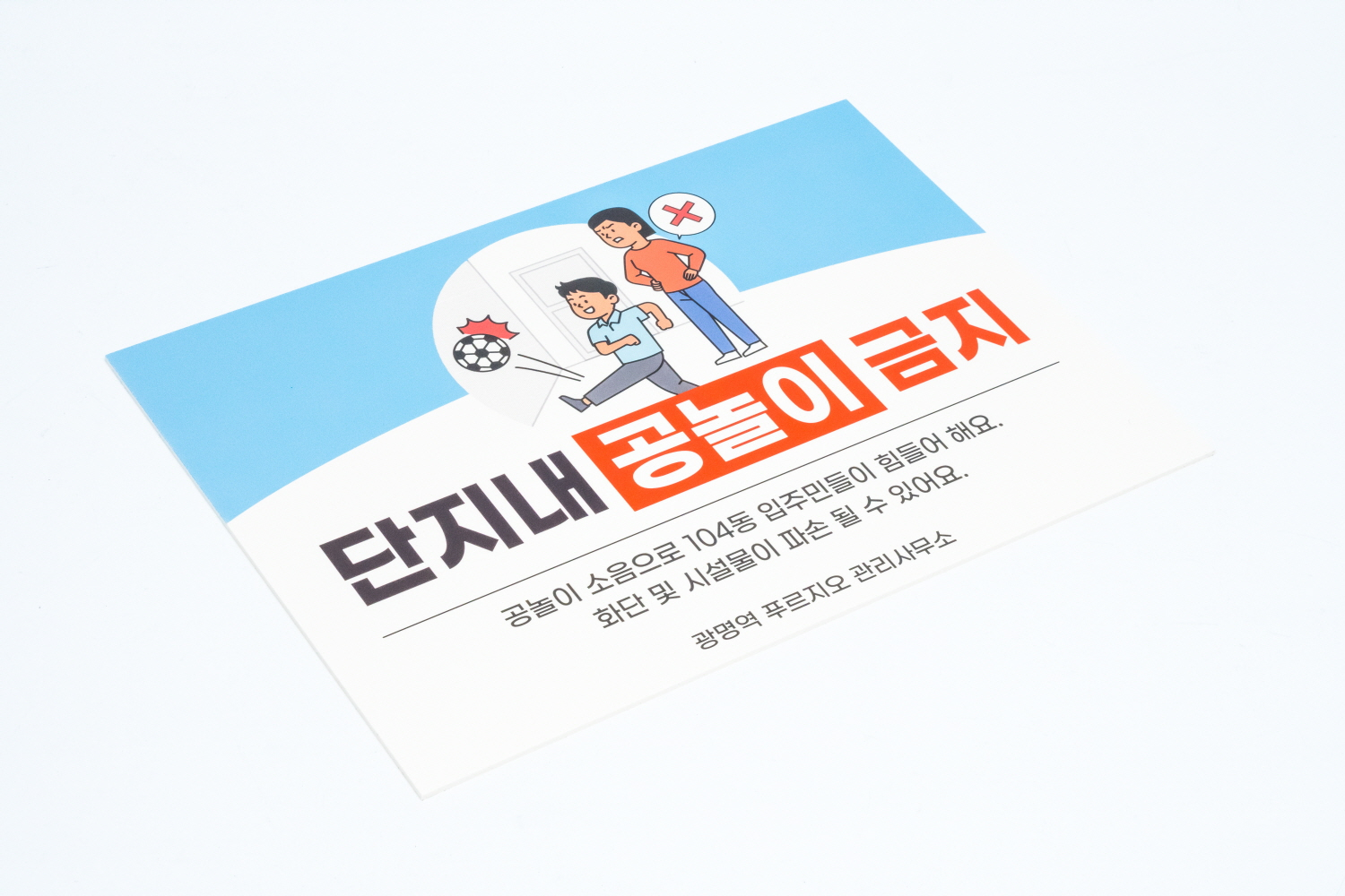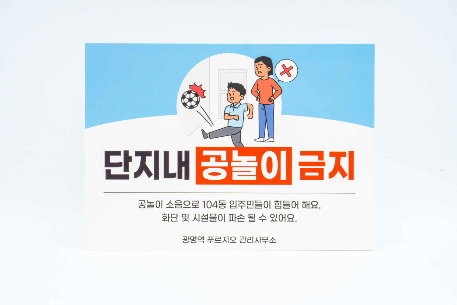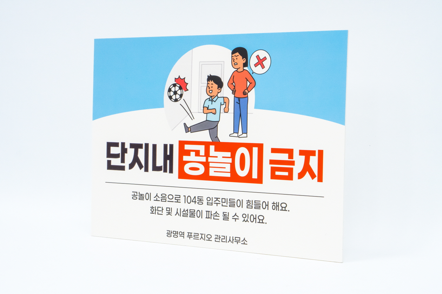 사람들이 많이 다니는 단지 내에서 공놀이를 금지하는 문구를 알리고 있으며,
