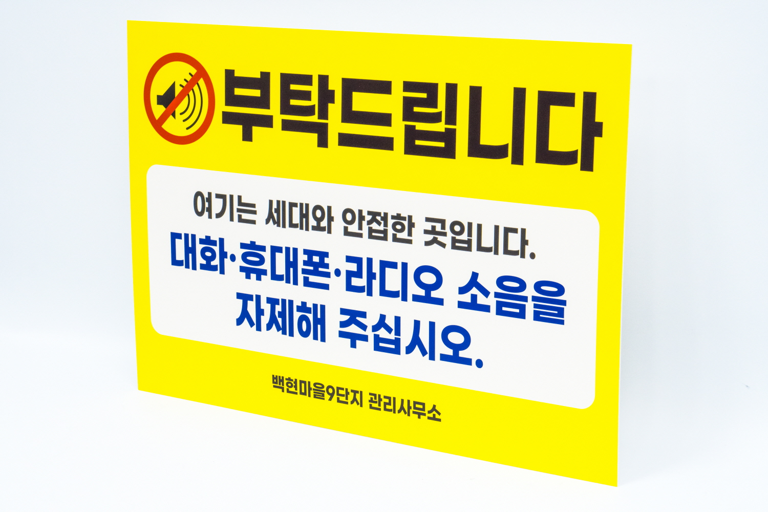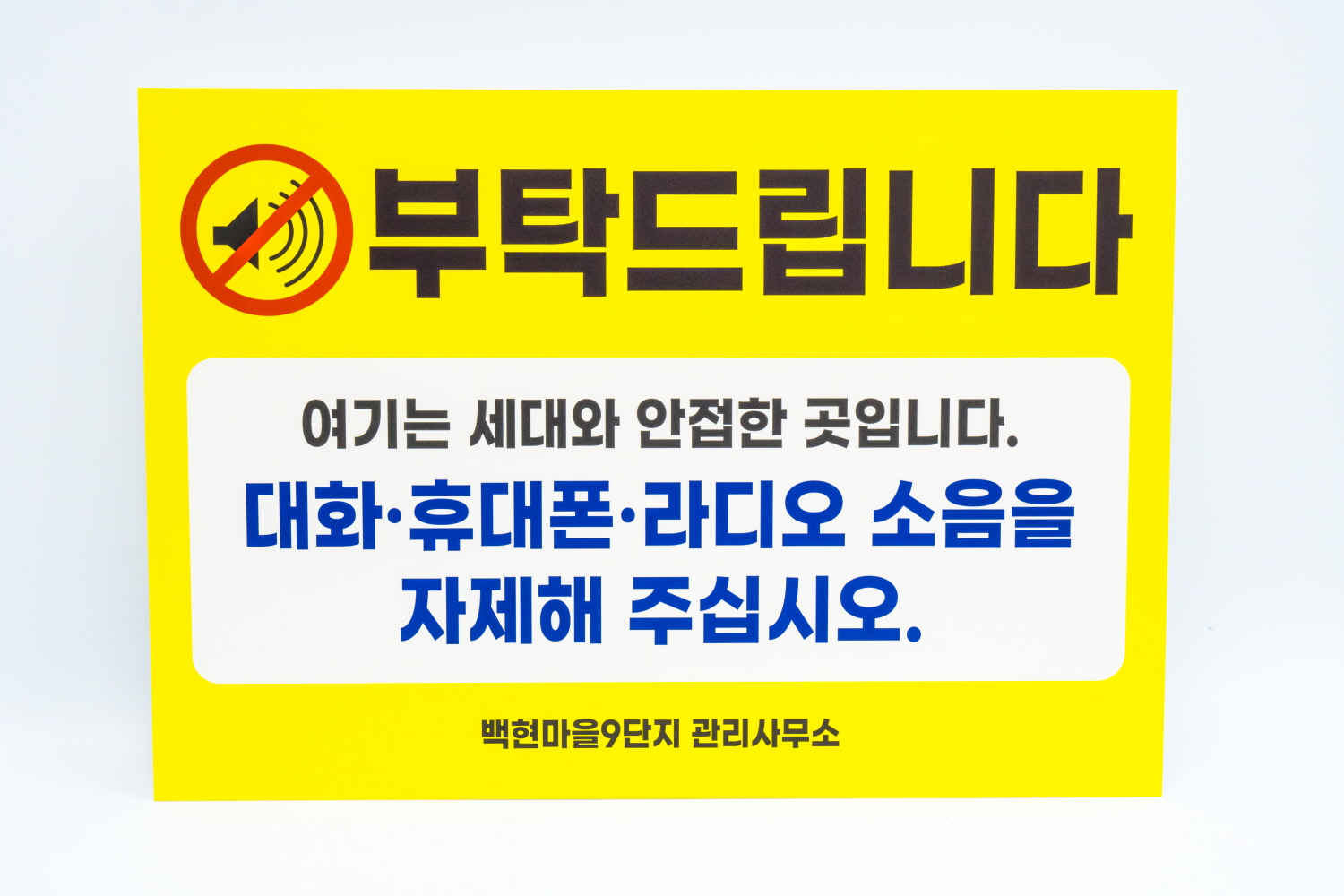 백현마을 9단지 관리사무소에서 주문해 주신 소음자제 안내판 입니다.
