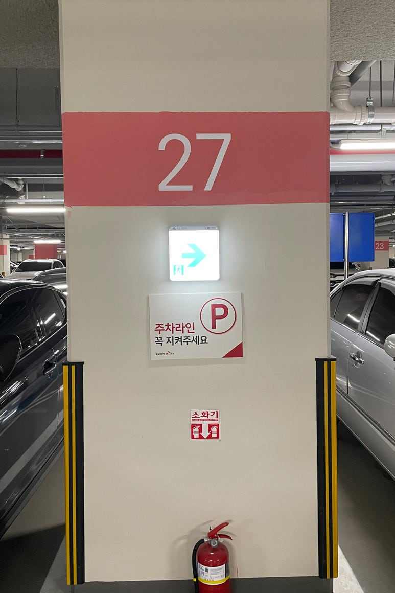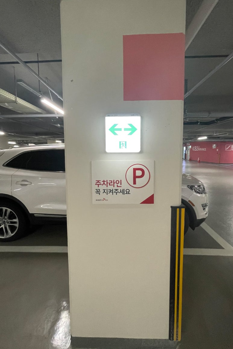 주차장 기둥에 설치하여 주차라인을 지킬 것을 알리는 안내판 입니다.