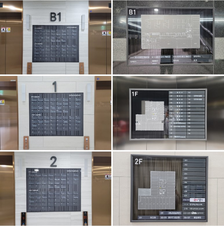 엘리베이터 와 계단 위치를 알려주는 안내판이 제작되었습니다.