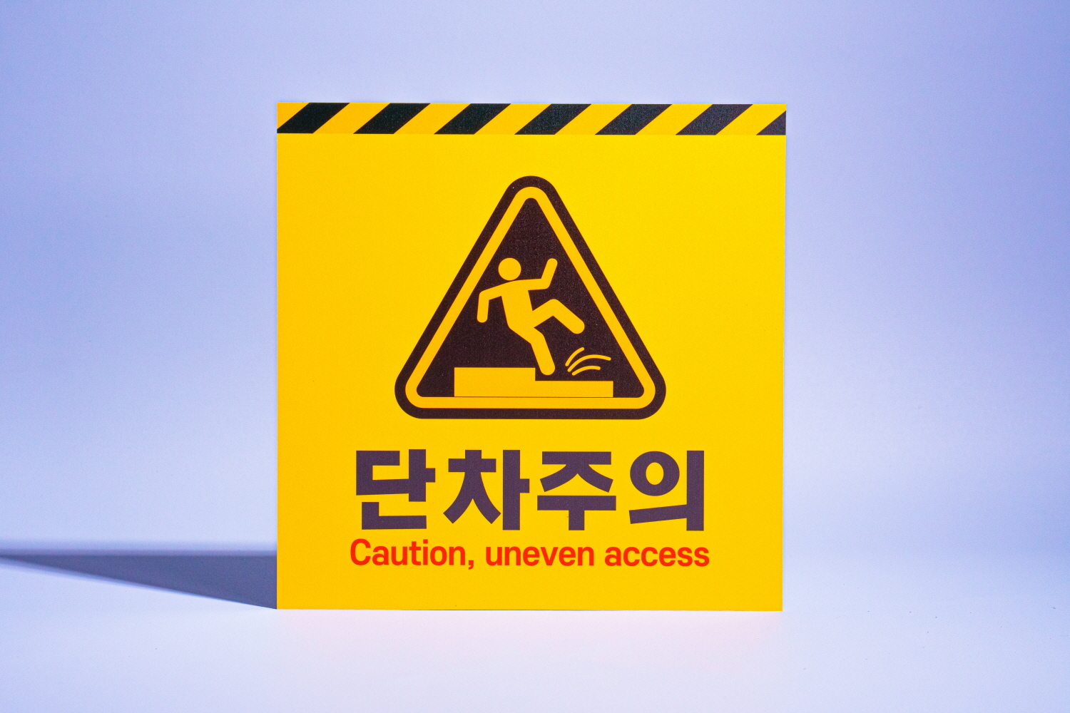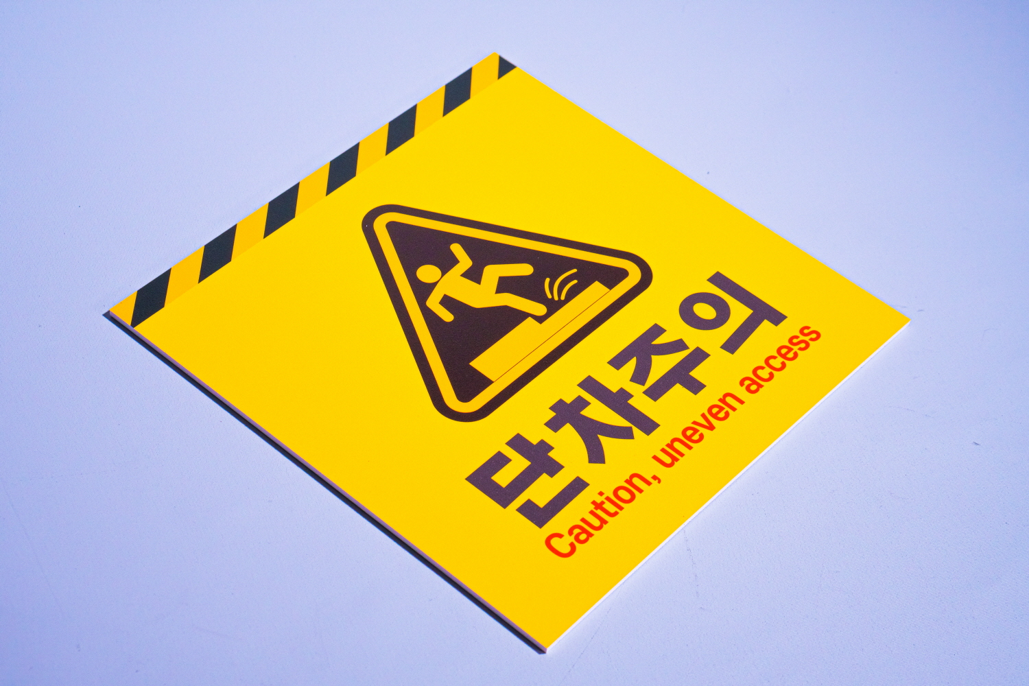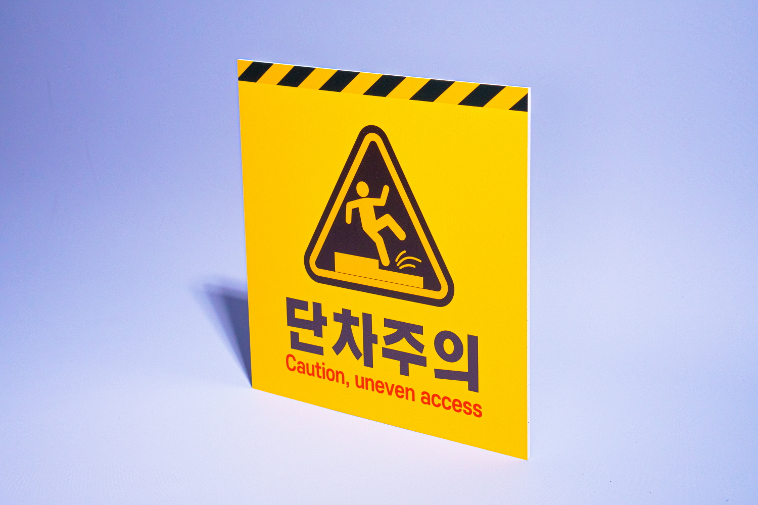 단차주의 안내판은 단차가 낮은 계단, 입구 문턱 등에 설치하여 단차의 위험을