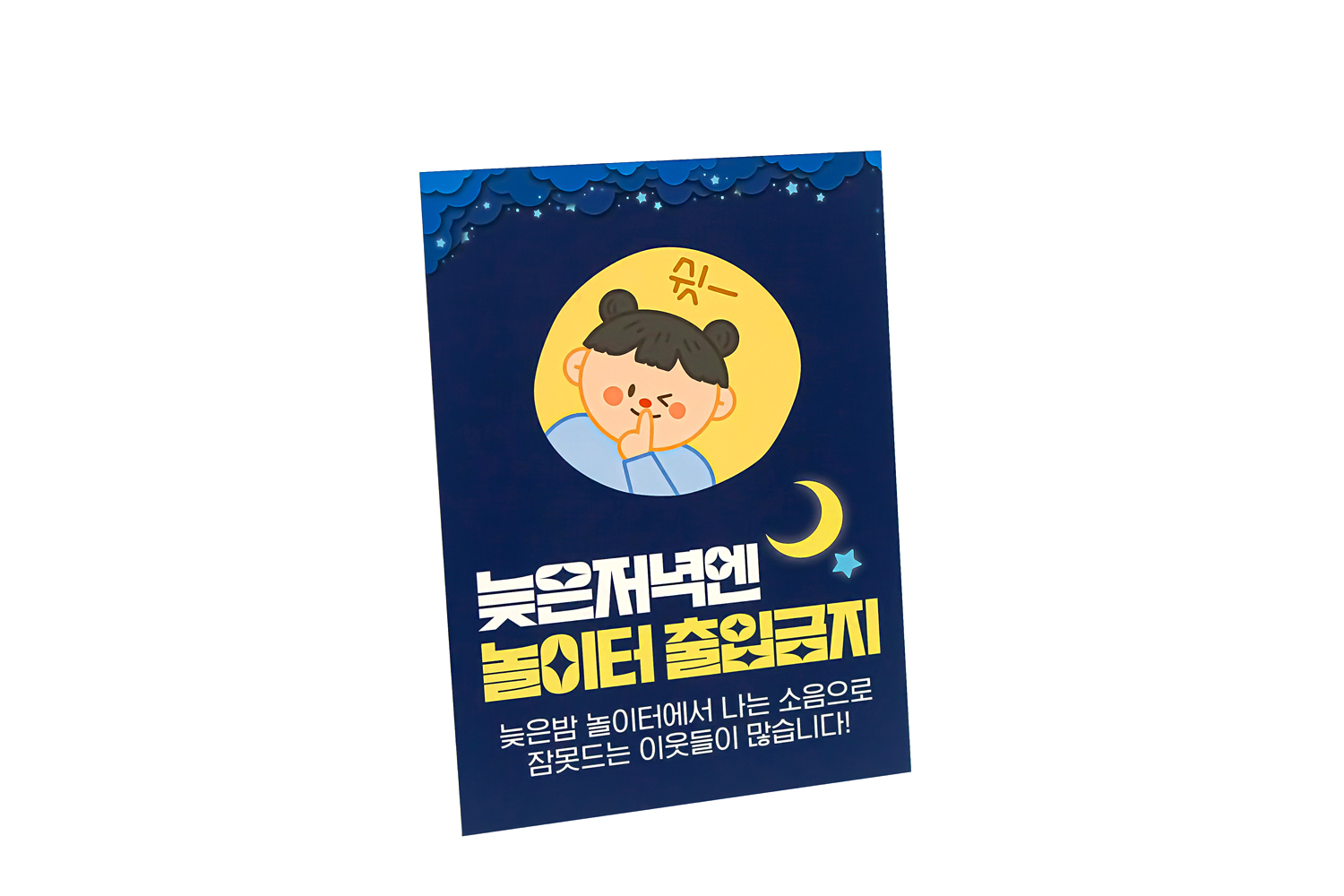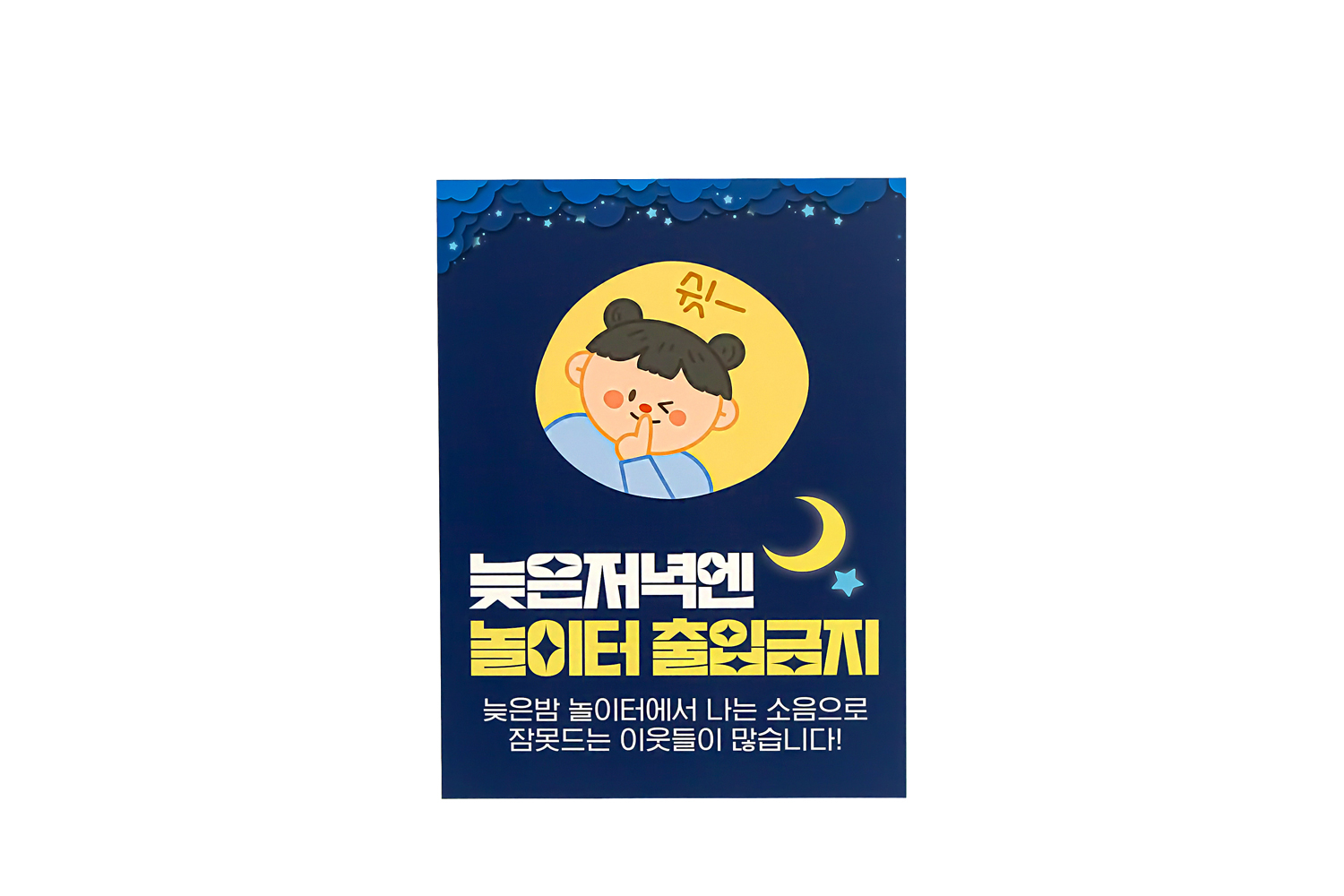 늦은 저녁 놀이터에서 발생하는 소음으로 인한 갈등을 미리 예방하기 위한 목적으로 제작된 안내판인데요!