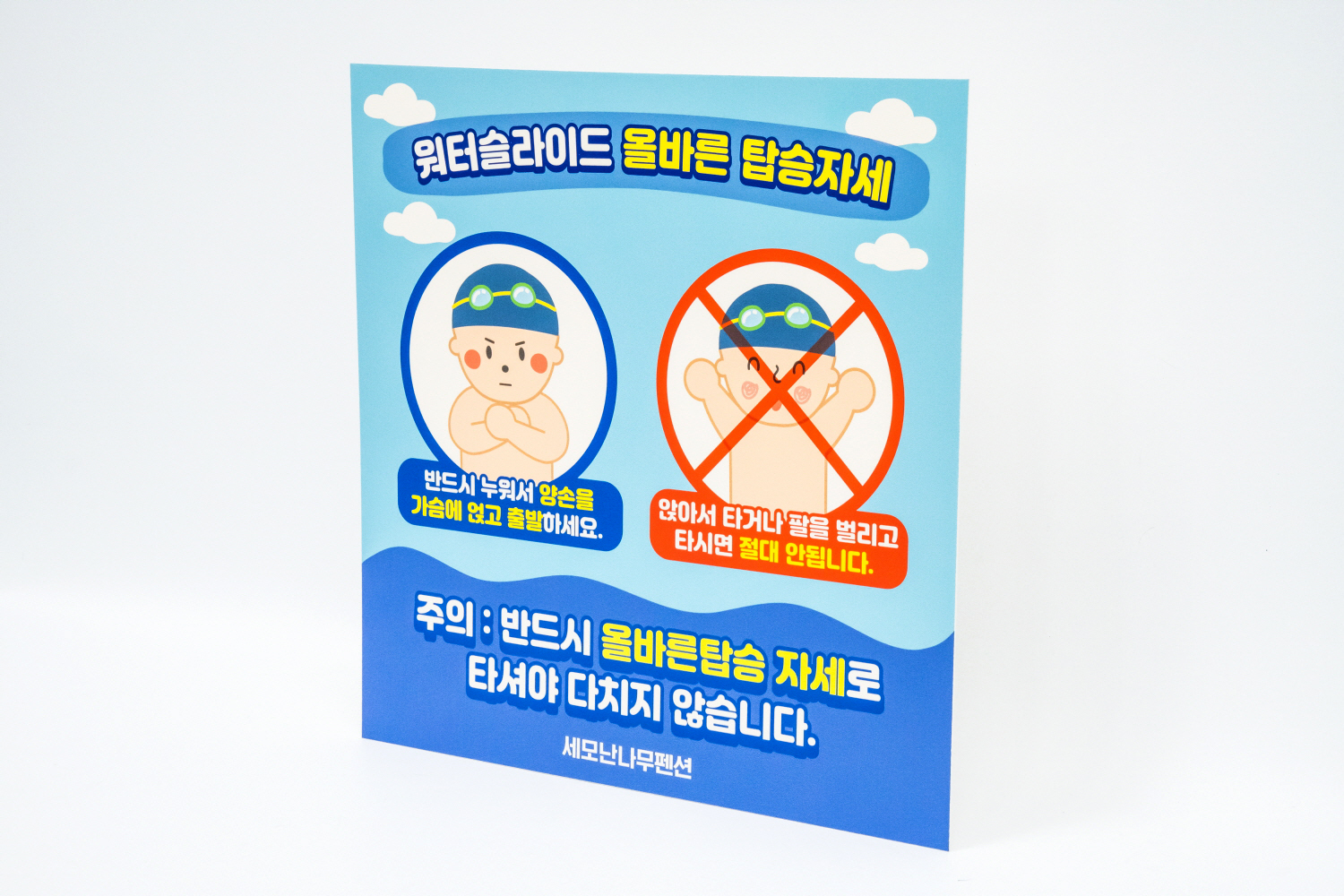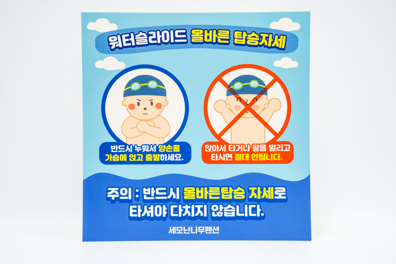 다음은 워터 슬라이드 올바른 탑승자세 안내판입니다!
