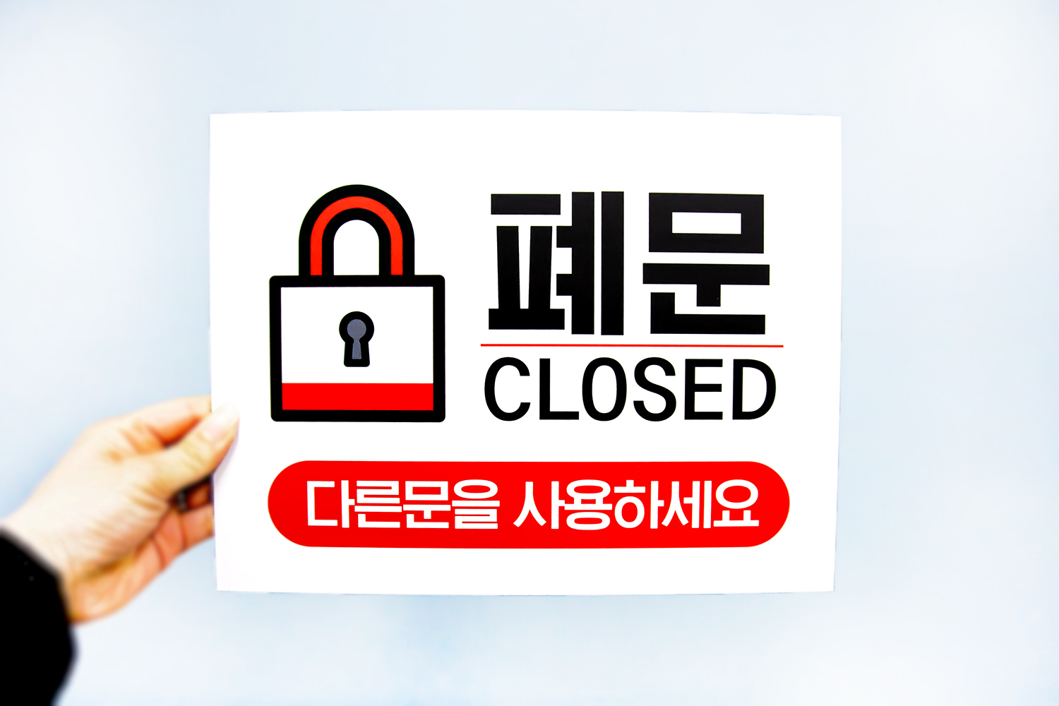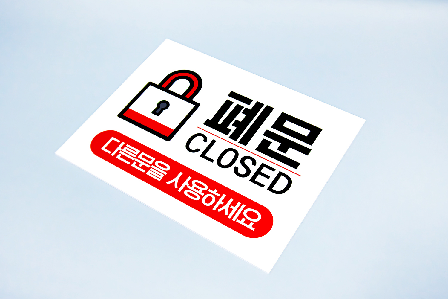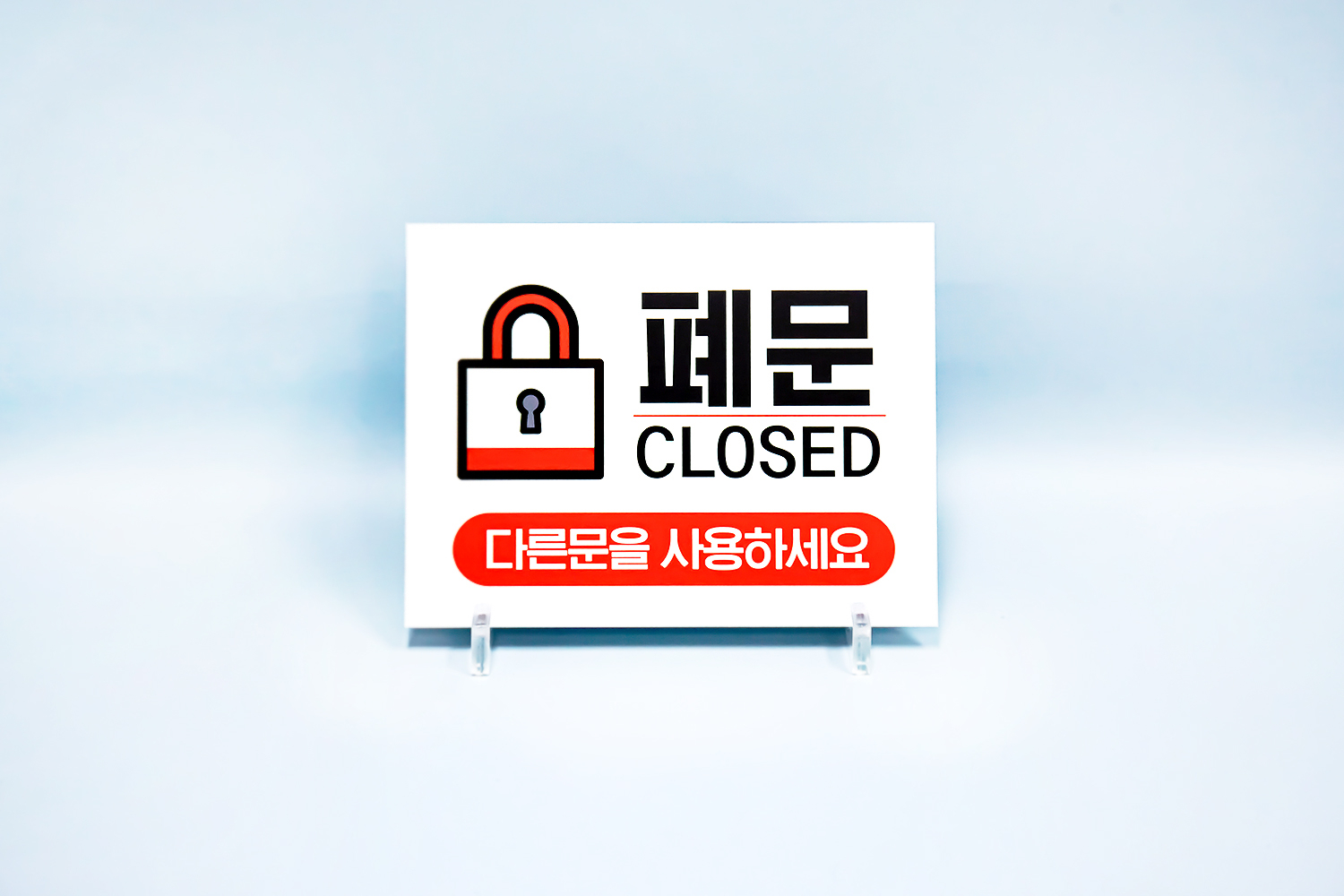 깔끔한 내용과 아이콘의 안내판으로 잠겨있는 문을 알리기 위해 제작된 안내판인데요!