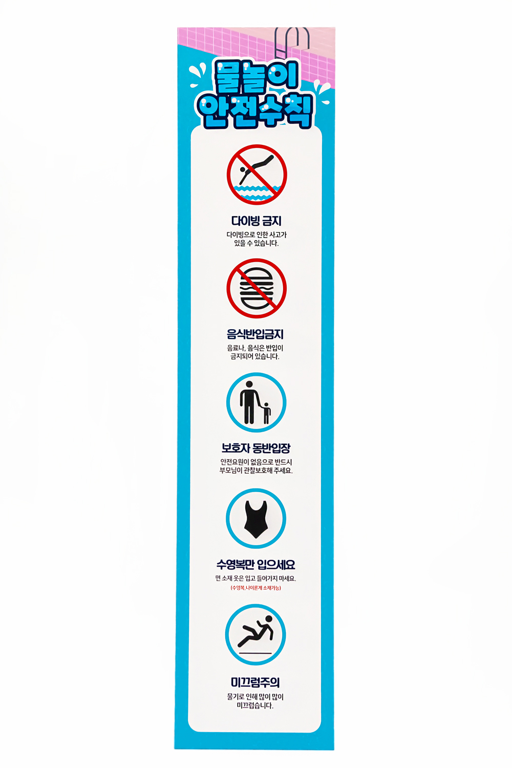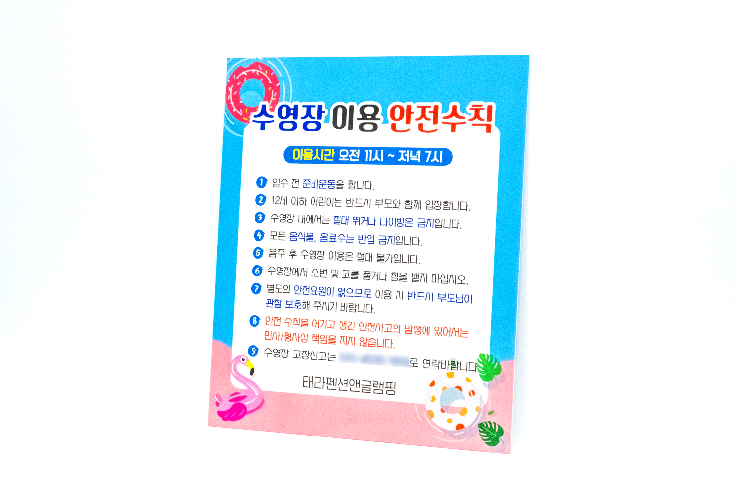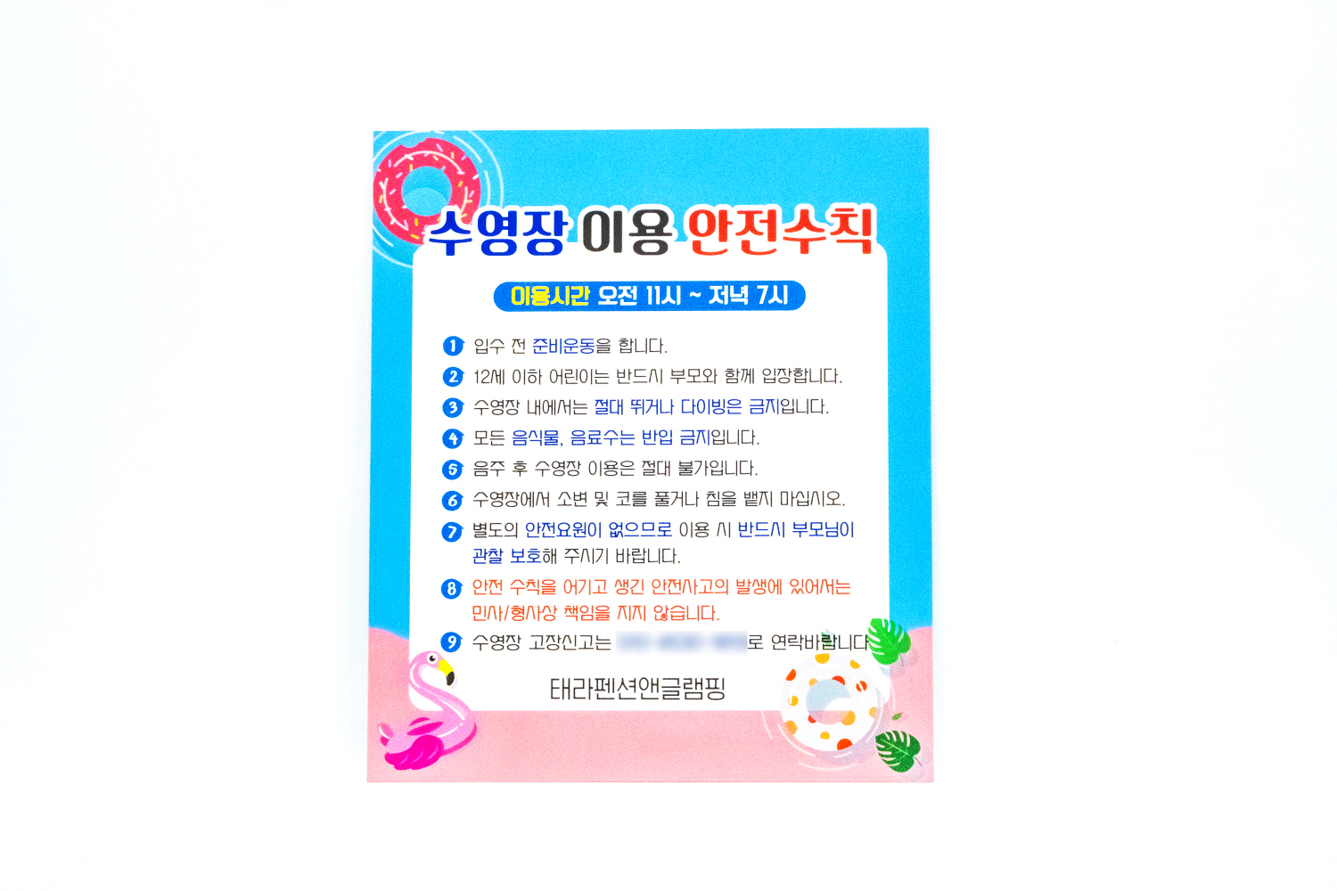 다음은 테라펜션앤글램핑에서 주문해 주신 수영장 이용 안전수칙 안내판입니다!