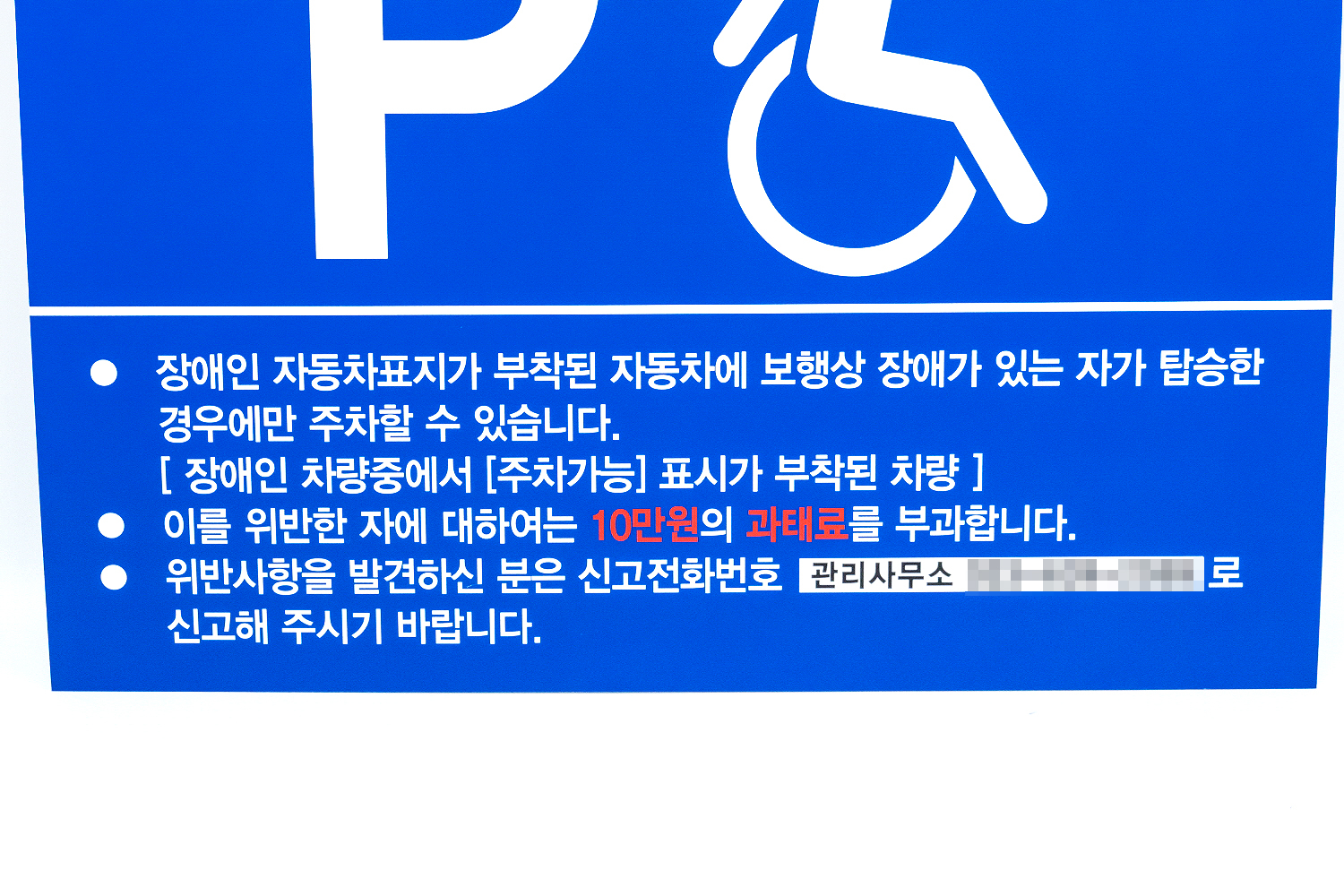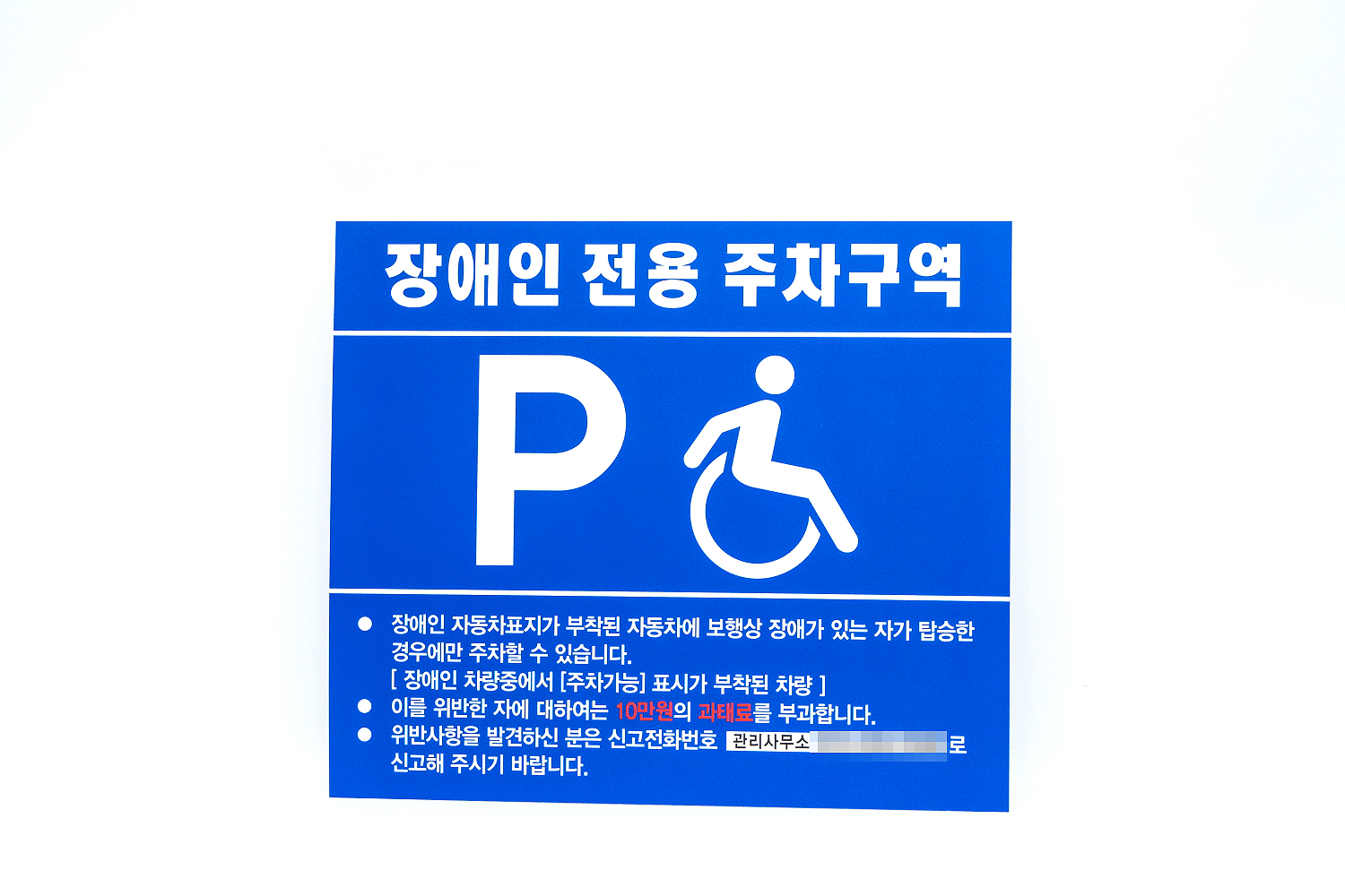 장애인 전용 주차구역에 일반 차량이 주차를 할 경우 10만원의 과태료가 부과됩니다!